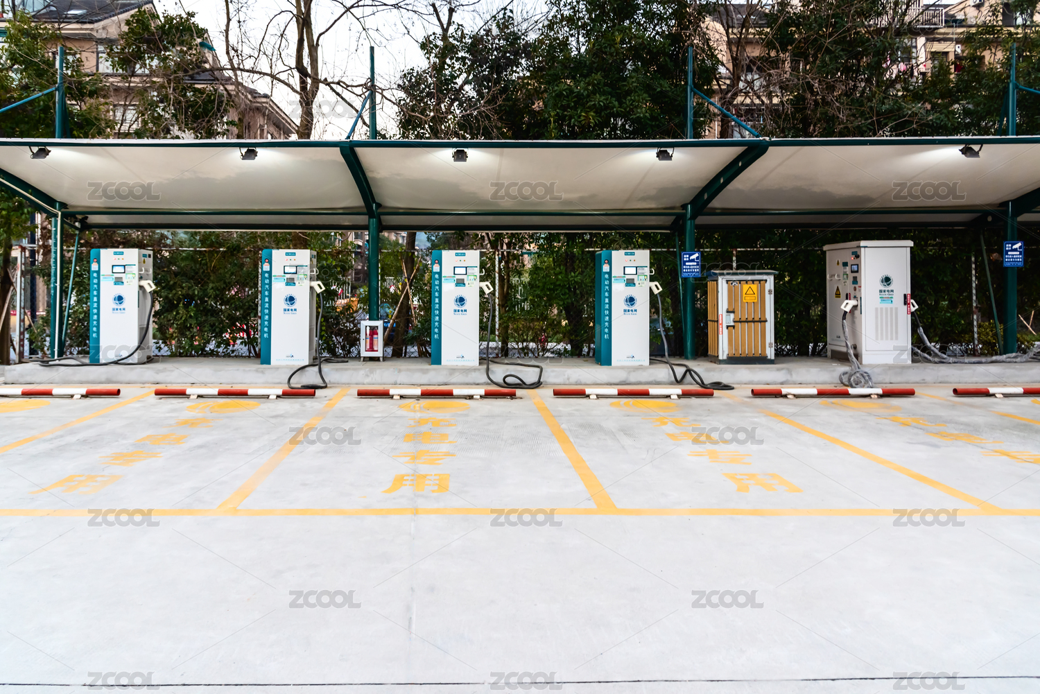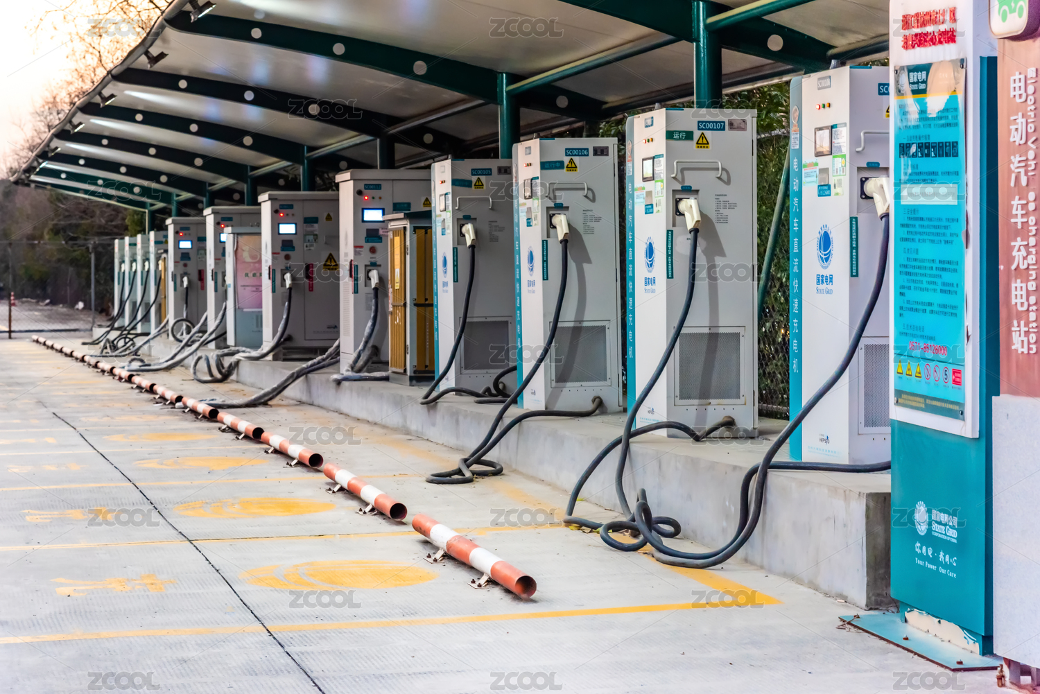 电动汽车充电站,停车场内一排电动汽车直流快速充电机
