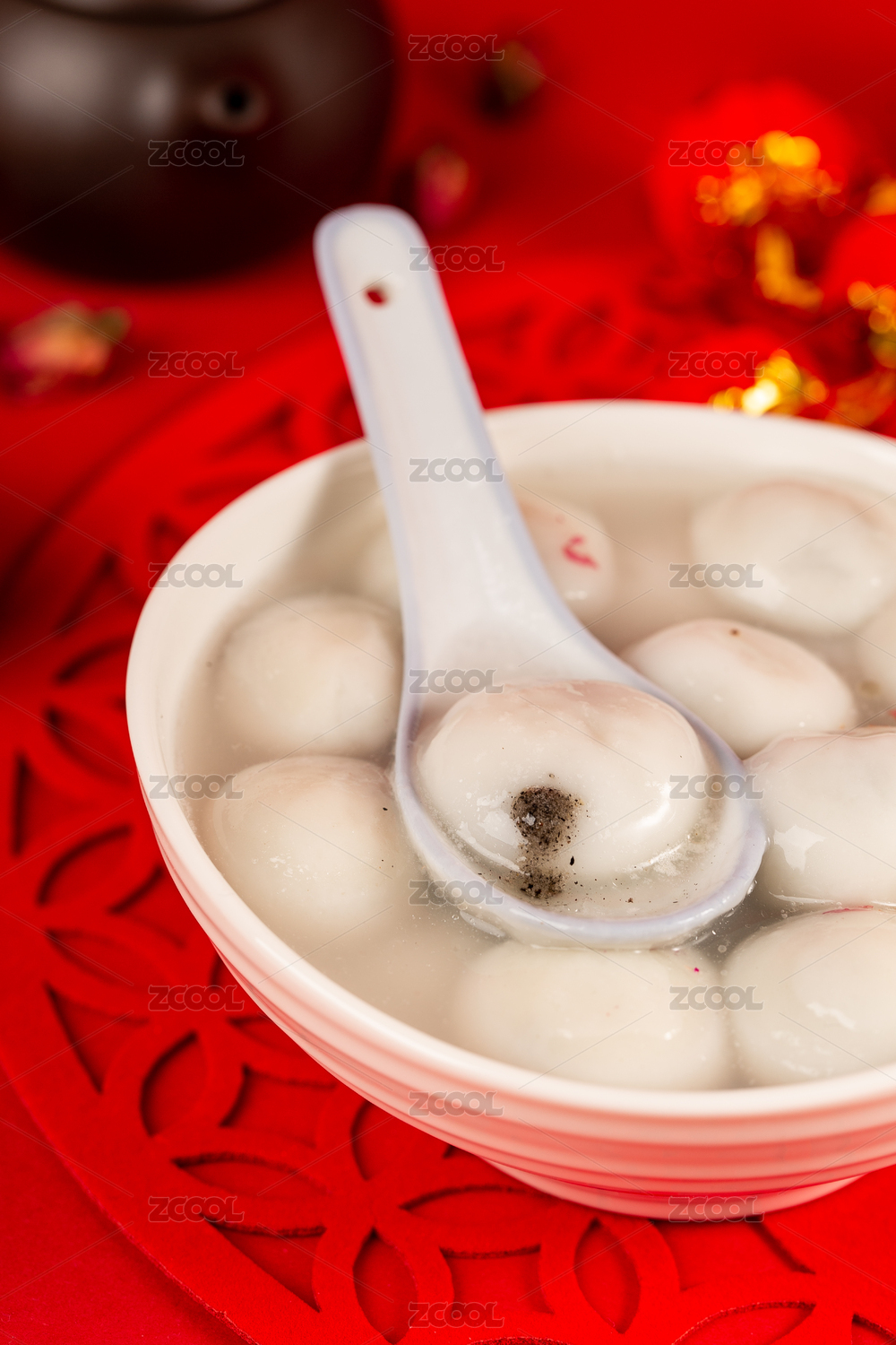 满满一碗传统美食芝麻汤圆放在红色背景上