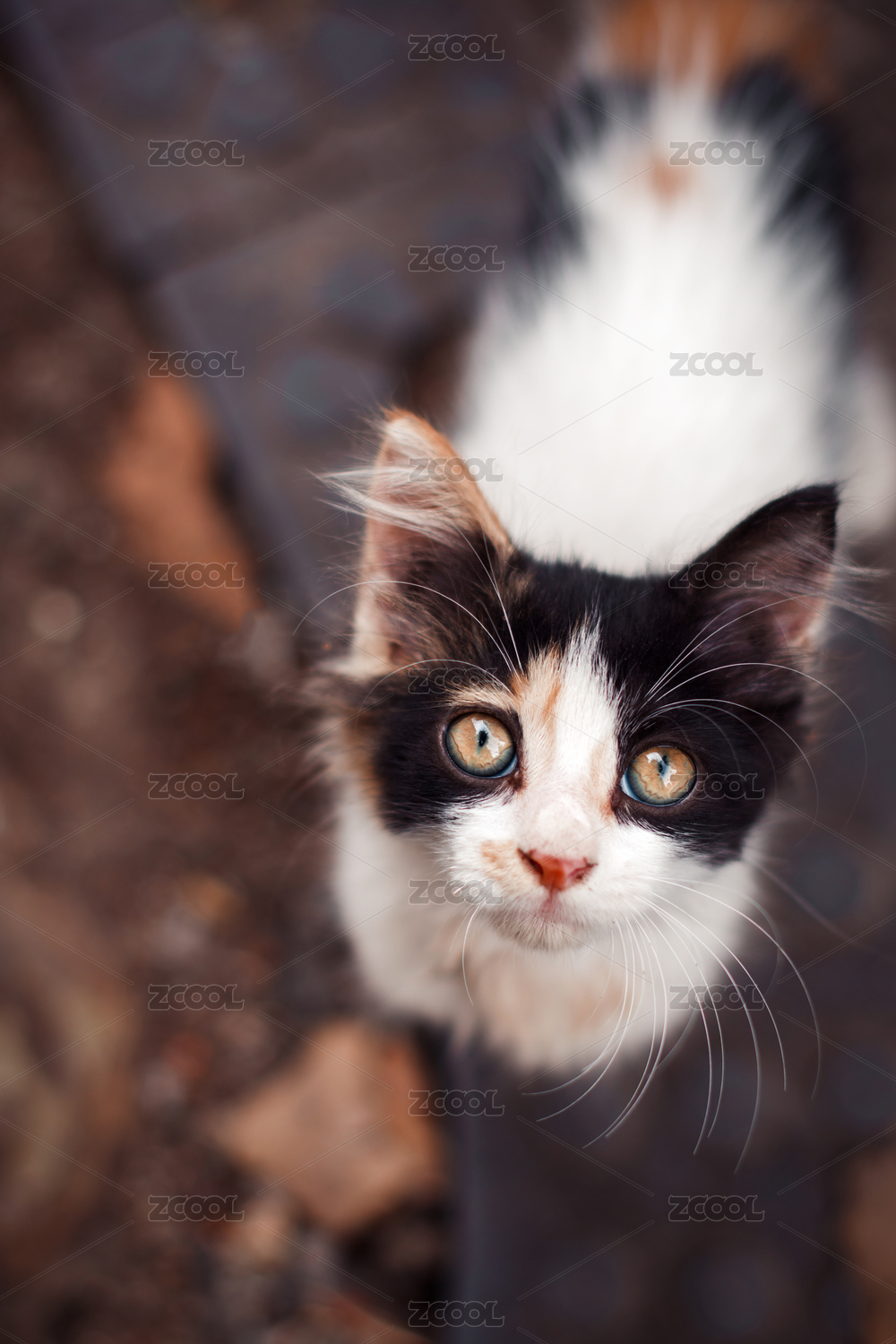 在秋季的路边一只可怜小猫咪抬头看着镜头乞讨食物