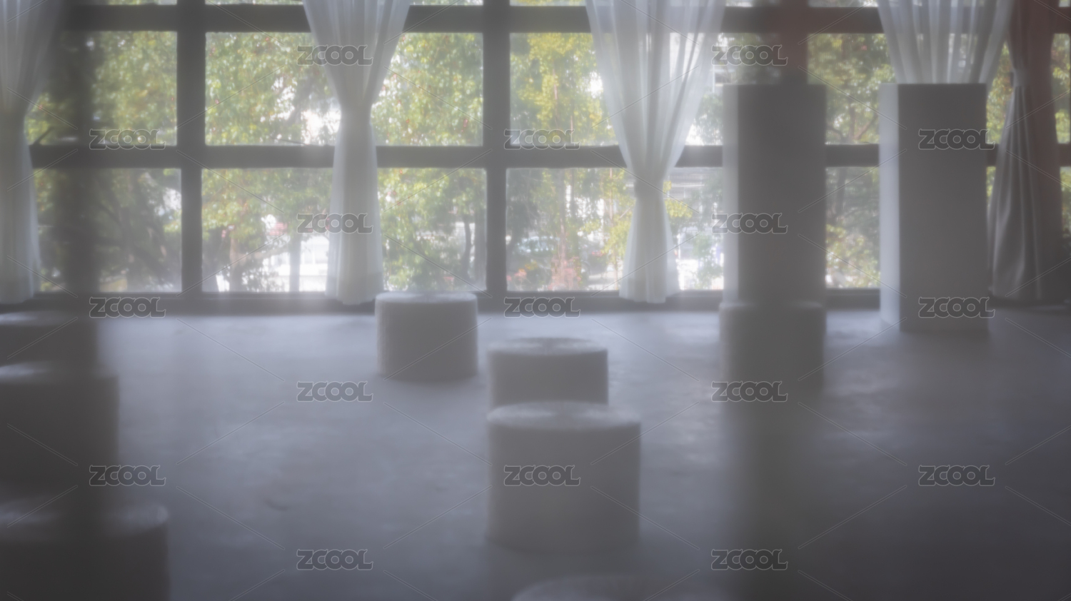 隔着薄纱拍摄的圆椅落地窗与窗外风景
