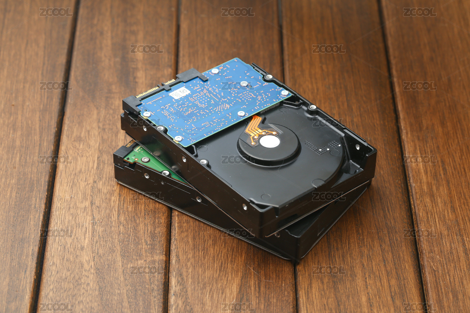 机械硬盘放在木桌上