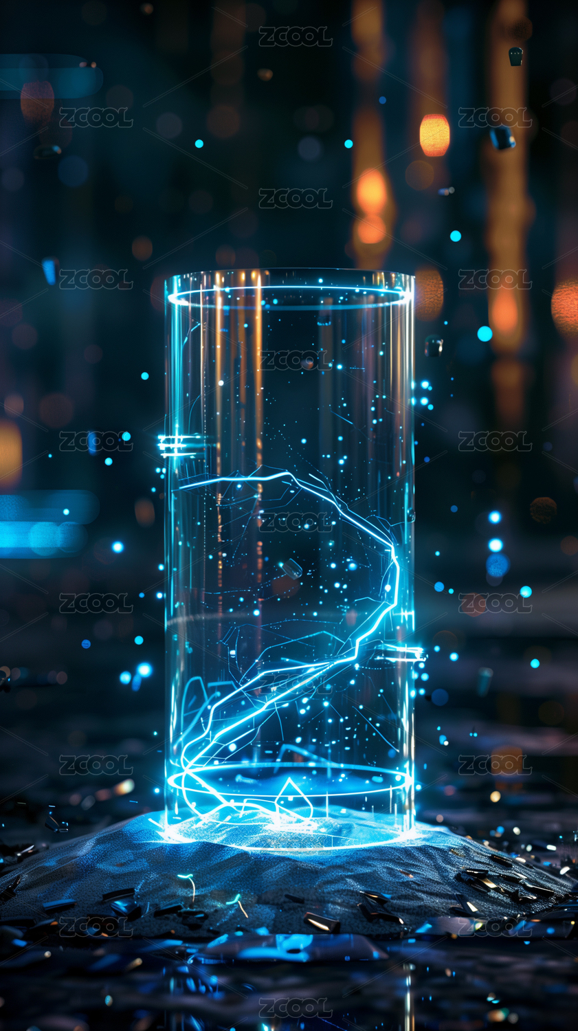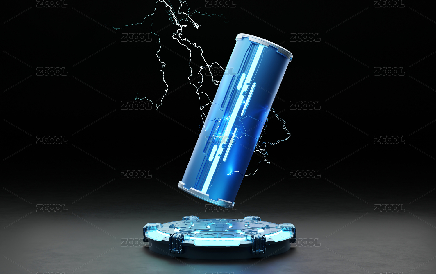 黑色场景中的圆柱蓝色发光电池3d模型插画