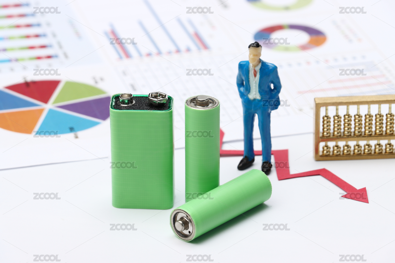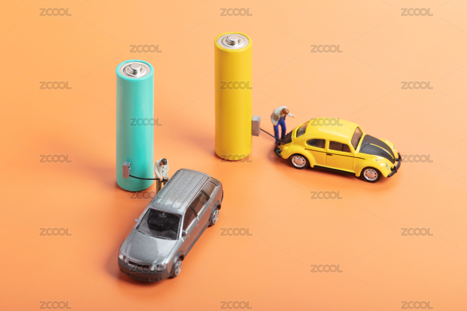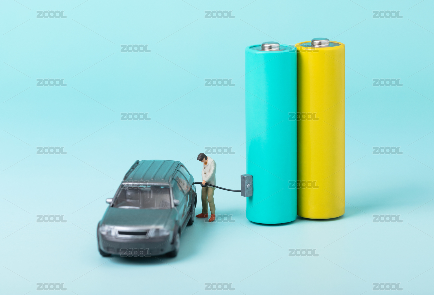 微缩创意电池铺成的道路上行驶的新能源汽车
