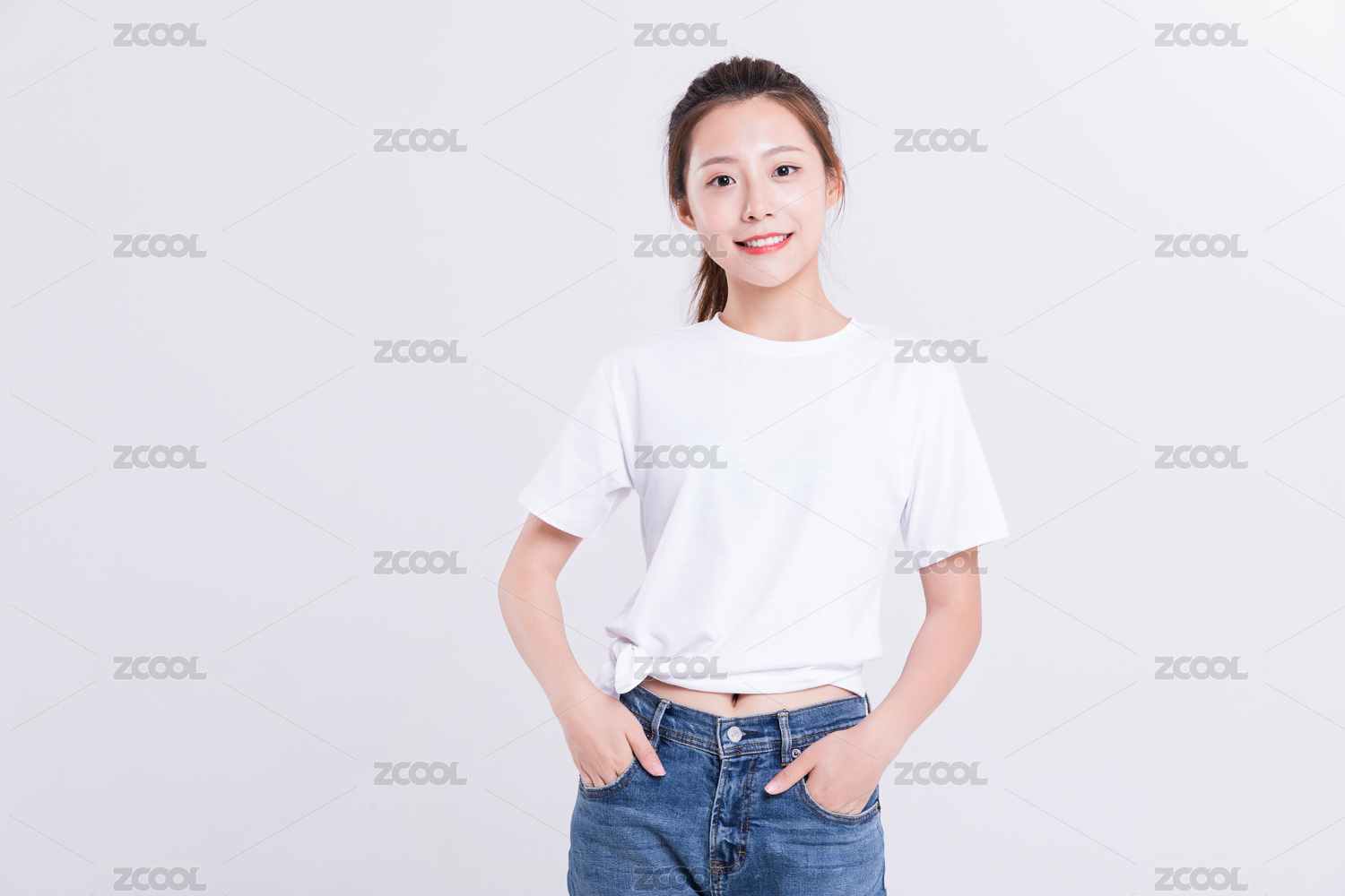青春阳光的年轻女性双手插袋面对镜头微笑