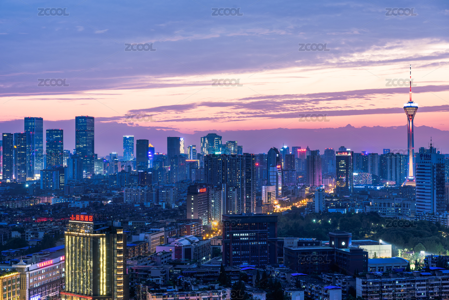 成都城市天际线夜景,背景是被称作“蜀山皇后”的四姑娘山幺妹峰剪影