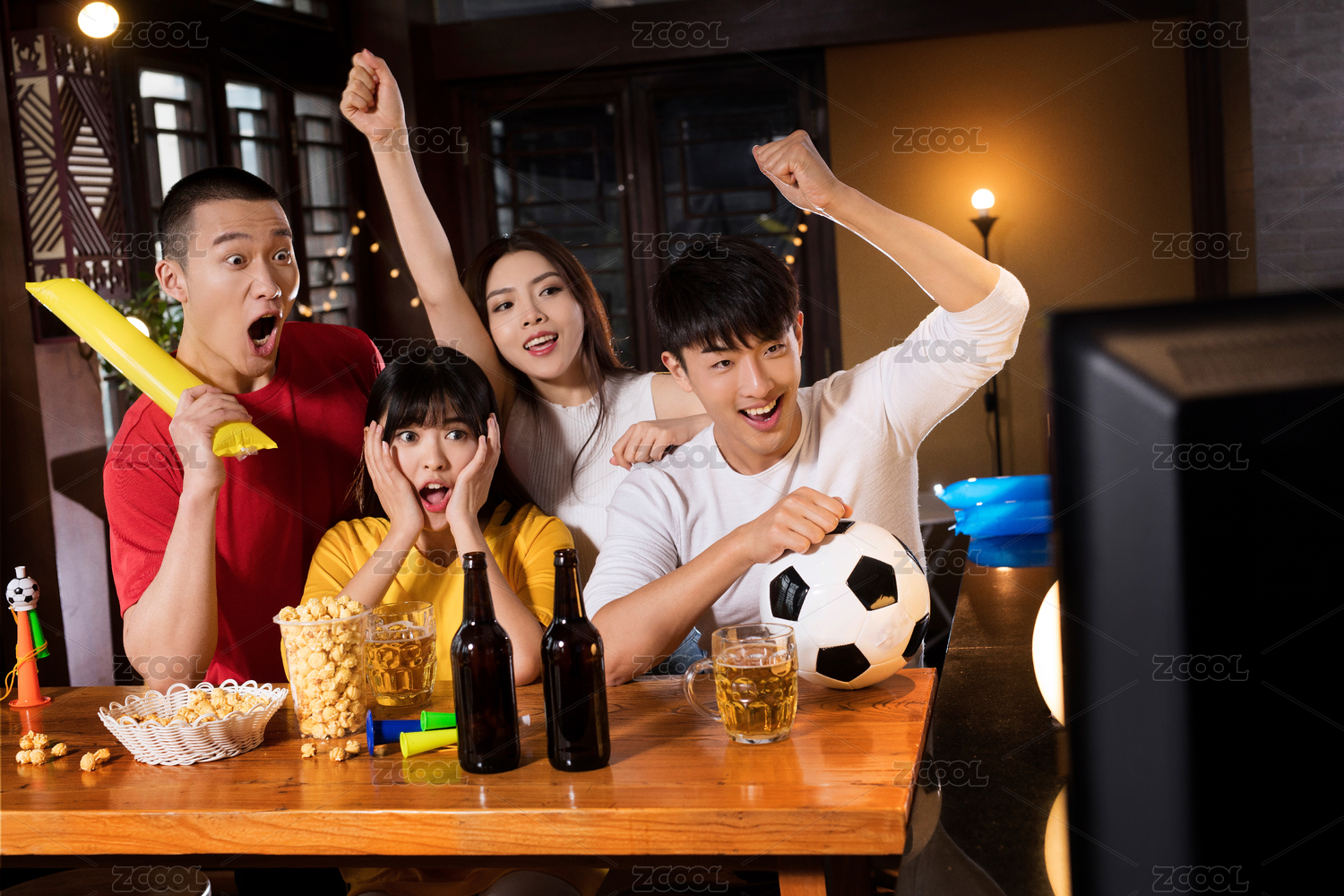四个球迷在酒吧观看足球比赛喝啤酒庆祝胜利