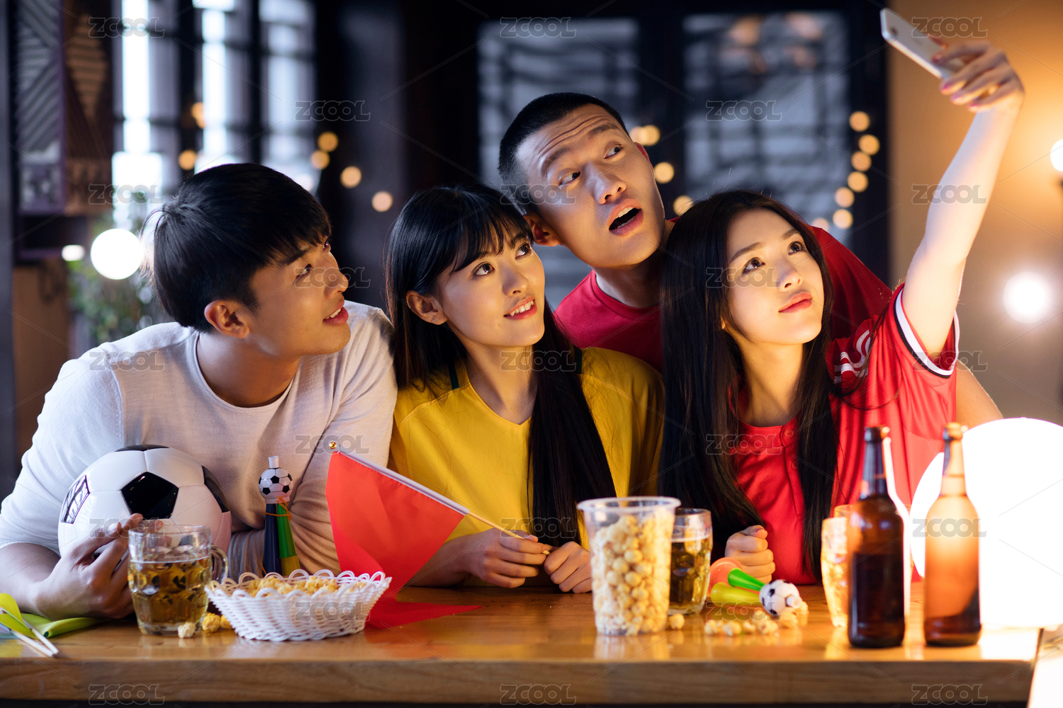 四个球迷在酒吧观看足球比赛时自拍庆祝胜利