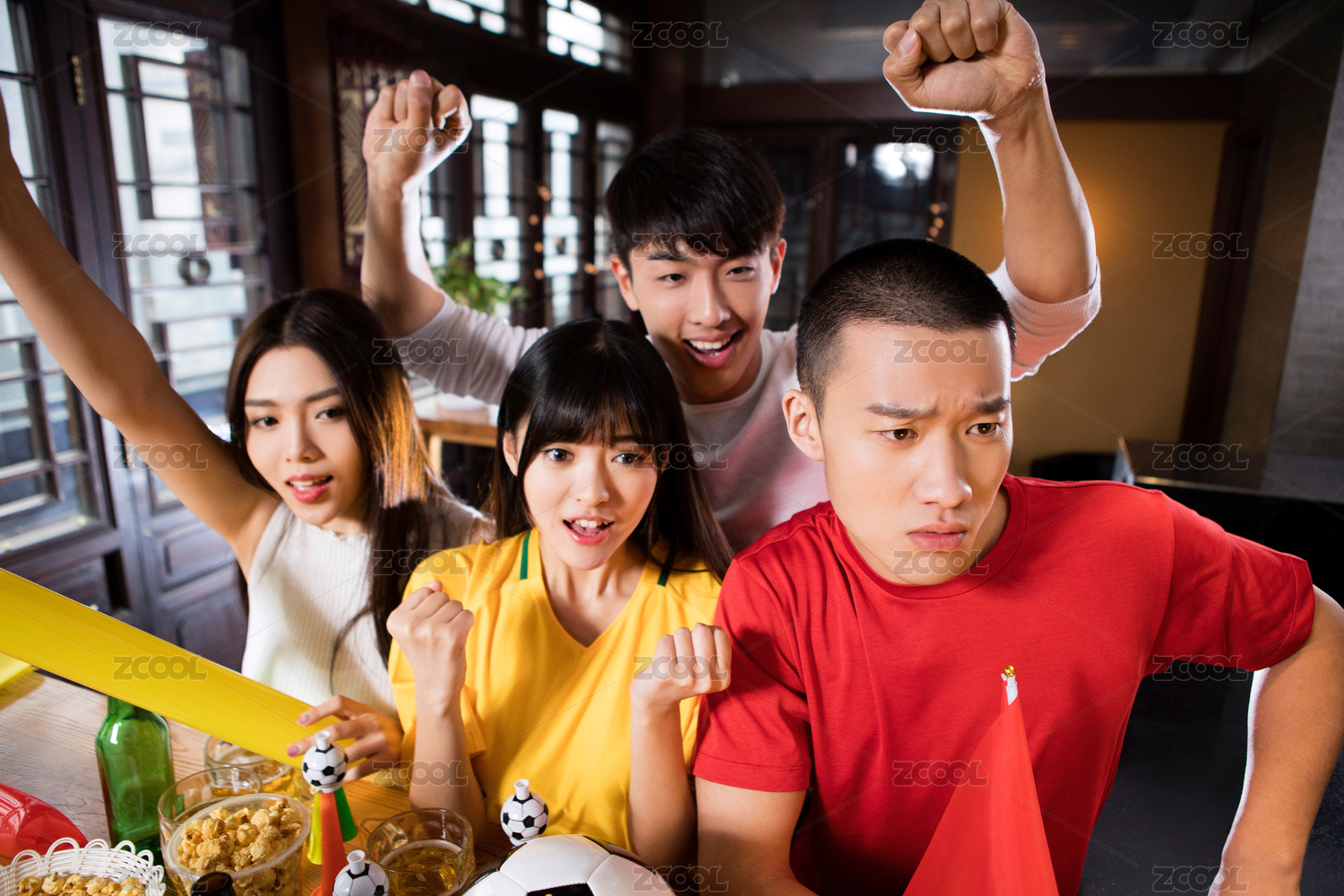 四个球迷在酒吧观看足球比赛庆祝胜利
