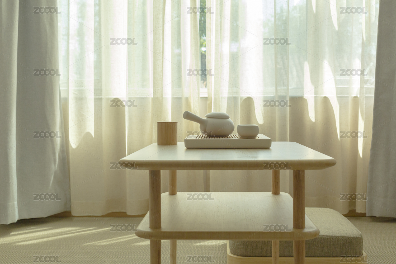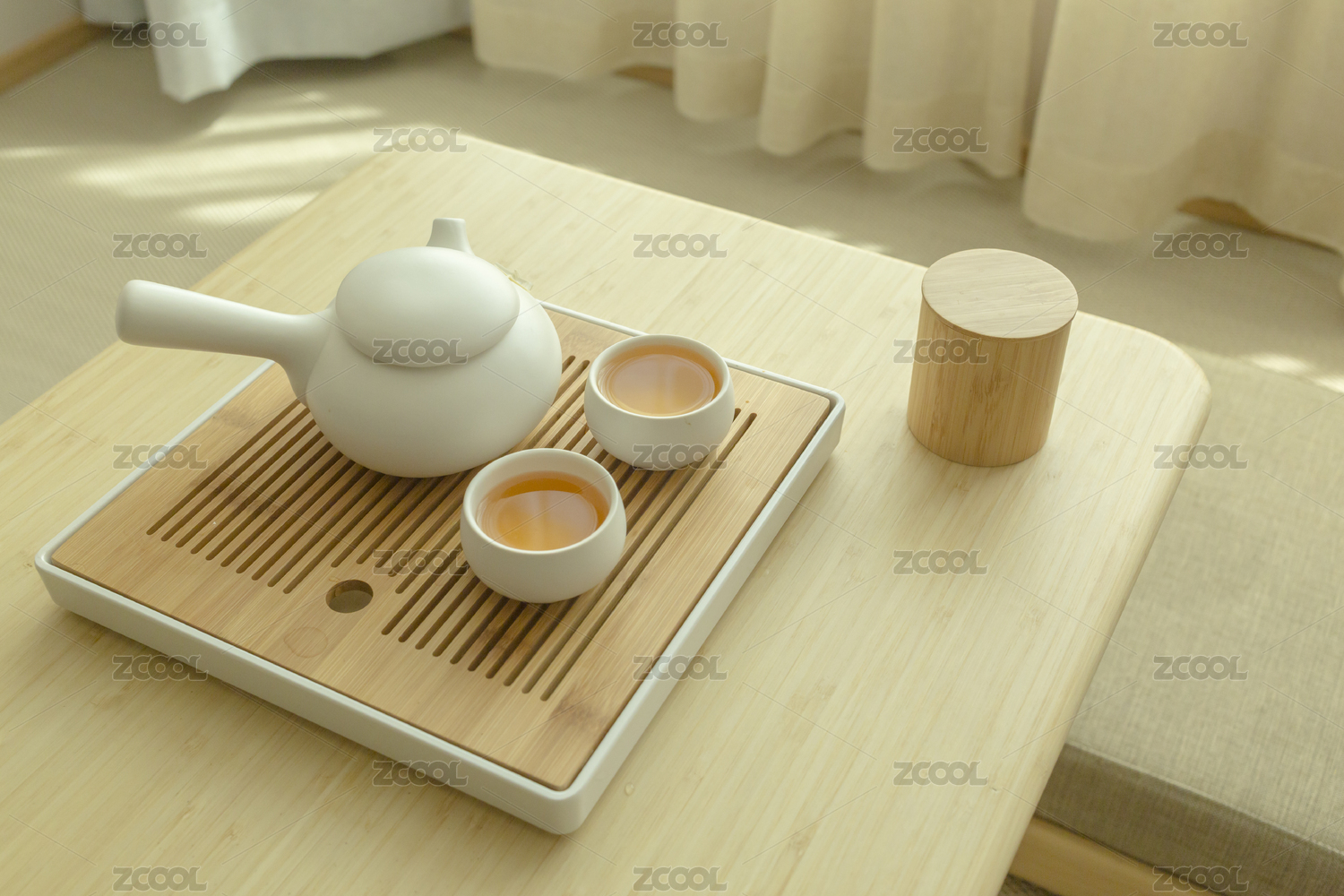 两杯热茶和一杯茶壶摆放在干净的木桌上