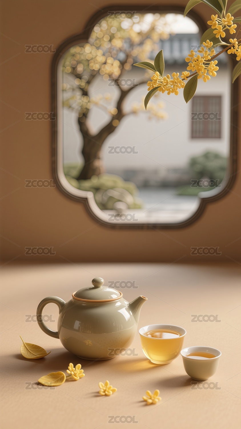秋天室内阳台飘窗温馨热茶红叶读书场景