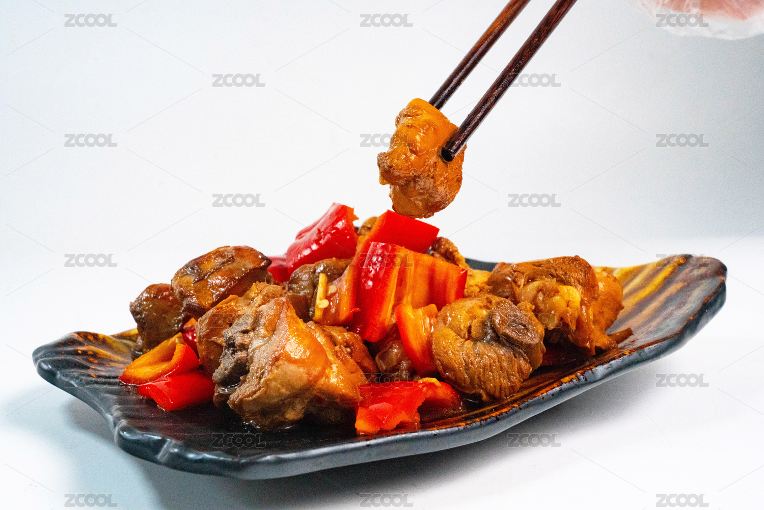盘子里用筷子夹起来的红烧鸡块