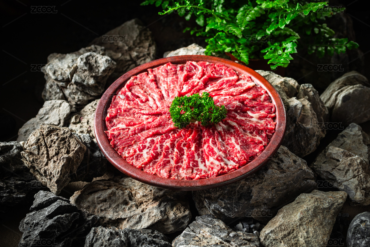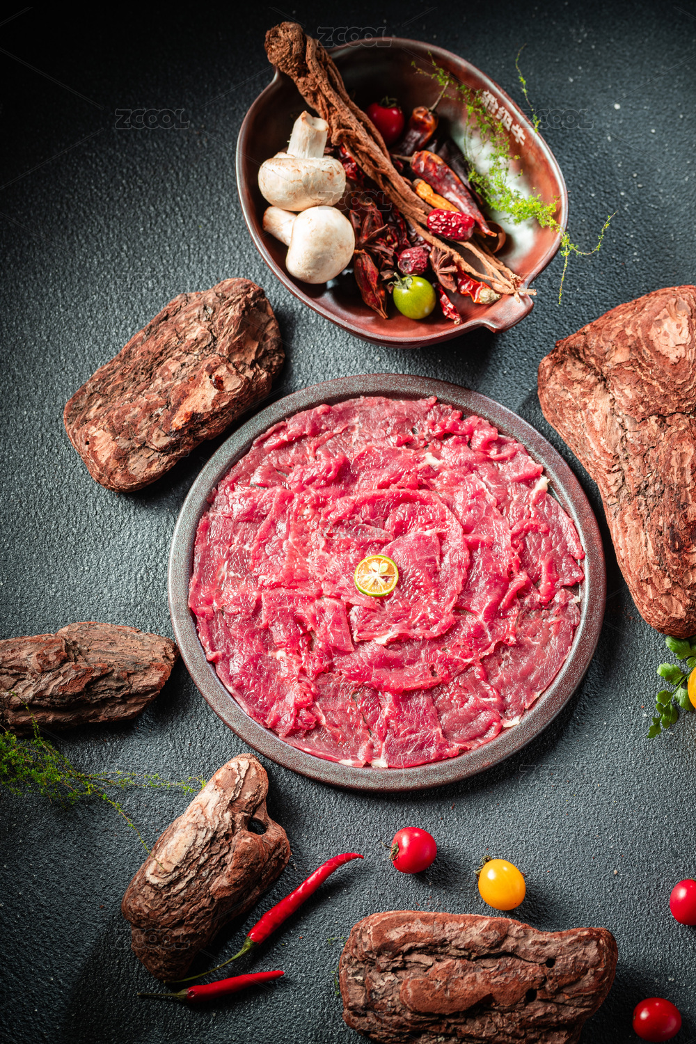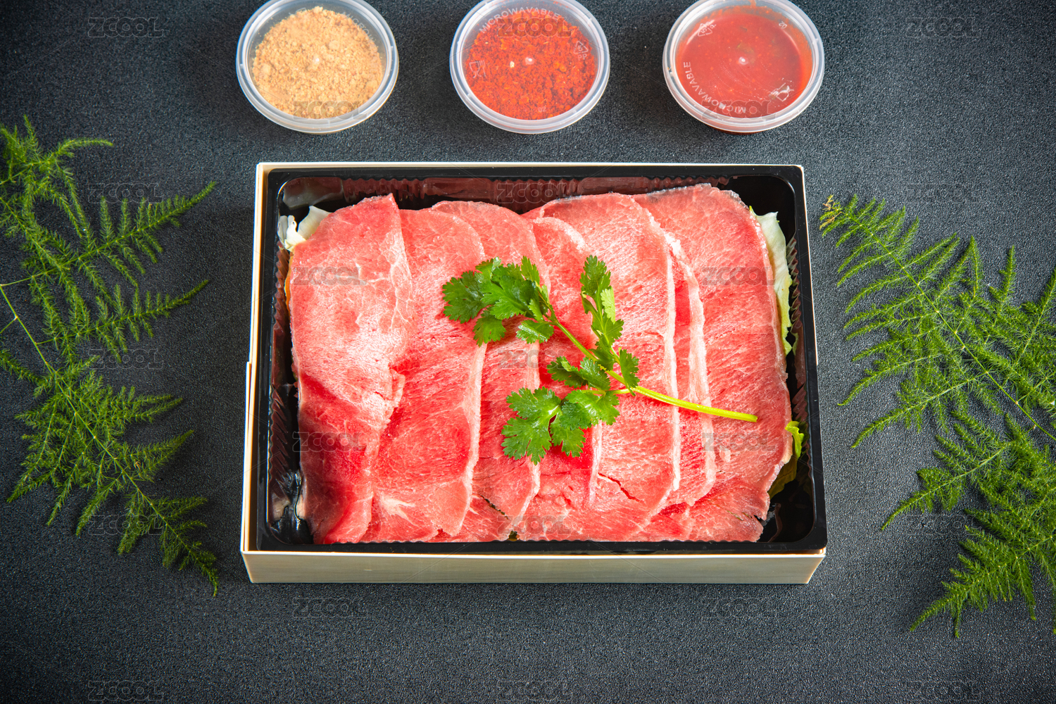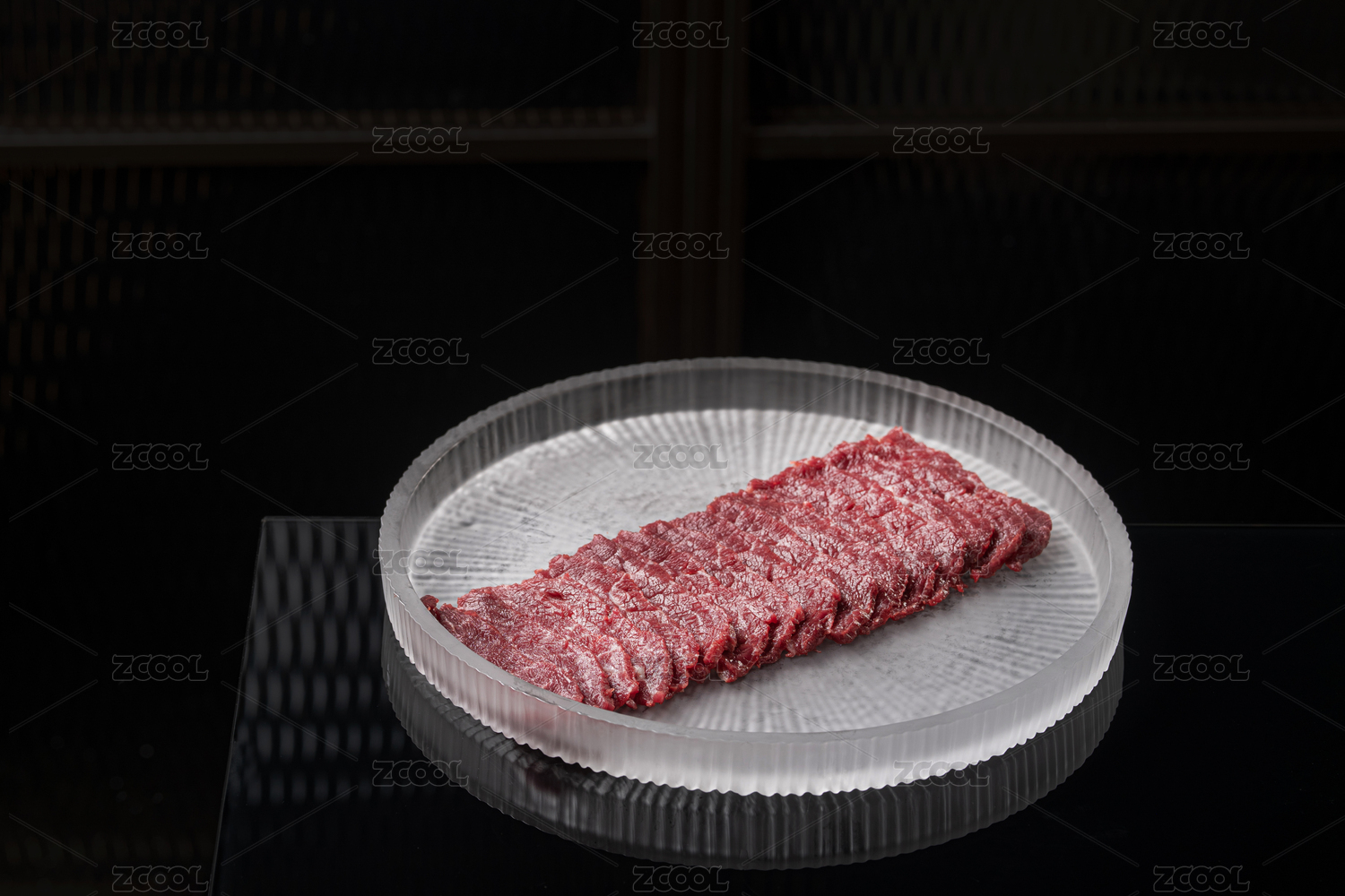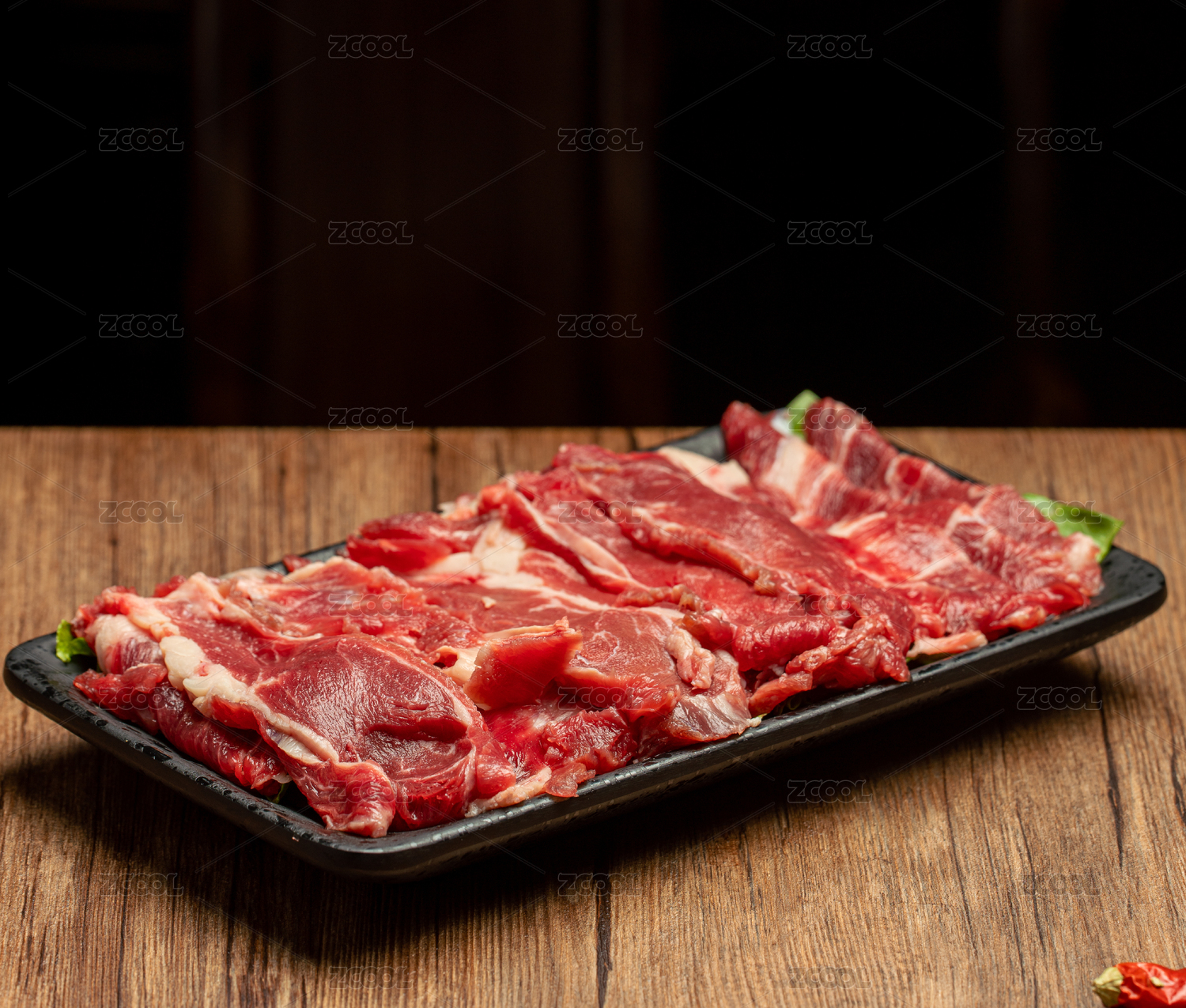 鲜切牛肉放在黑色盘子里