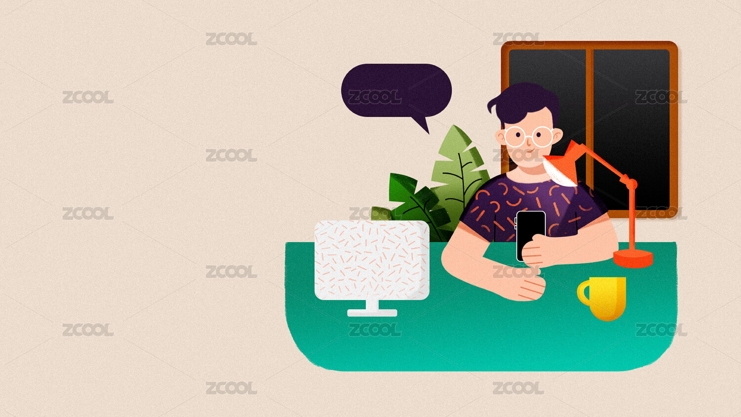 夜晚坐在桌前拿着手机工作的男人扁平插画