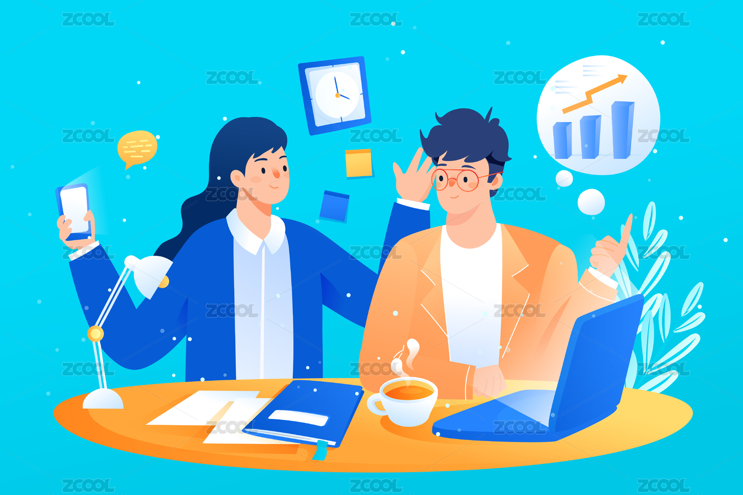 协作的男女提升工作效率,矢量扁平人物场景概念插画