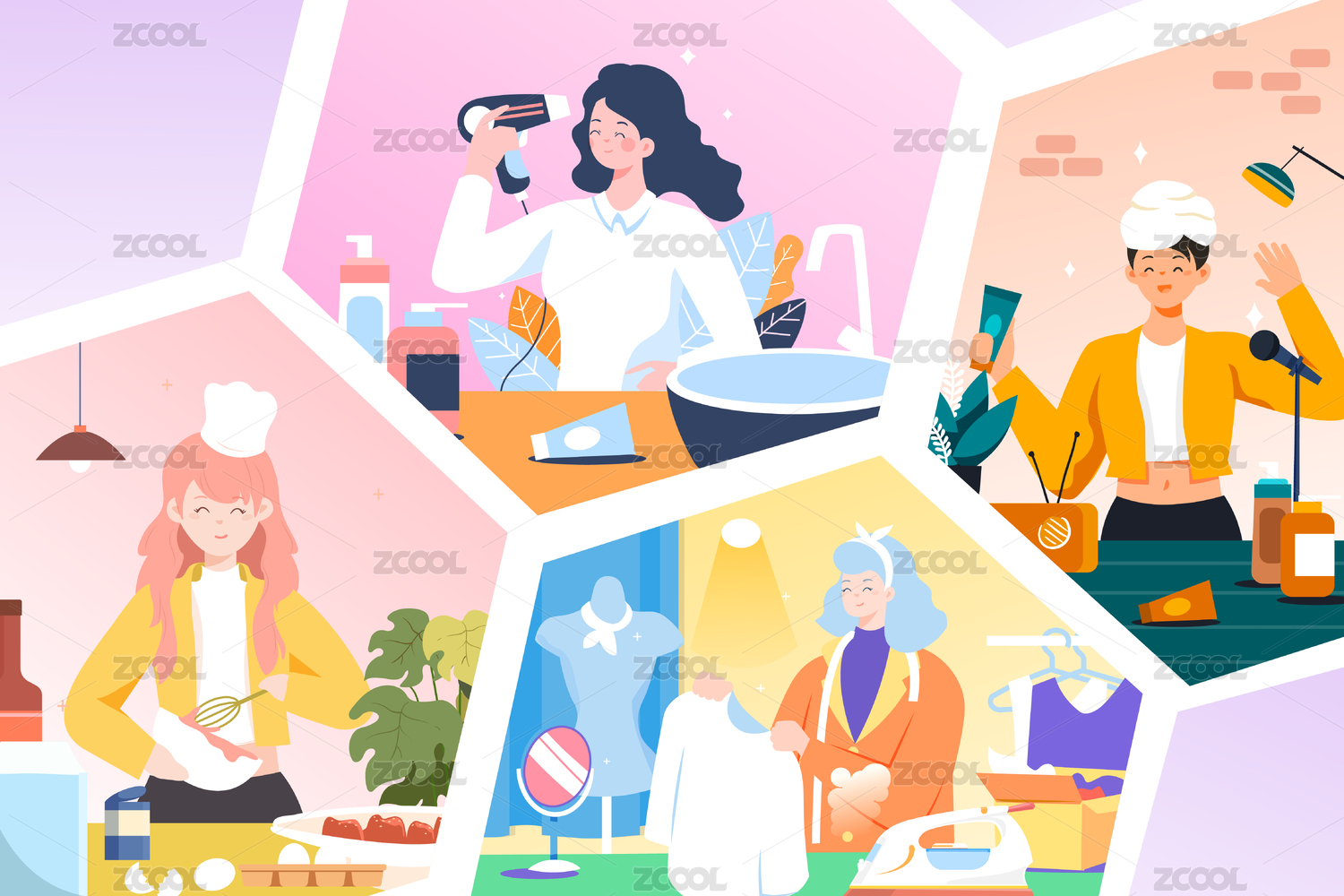 做不同工作的女孩矢量插画
