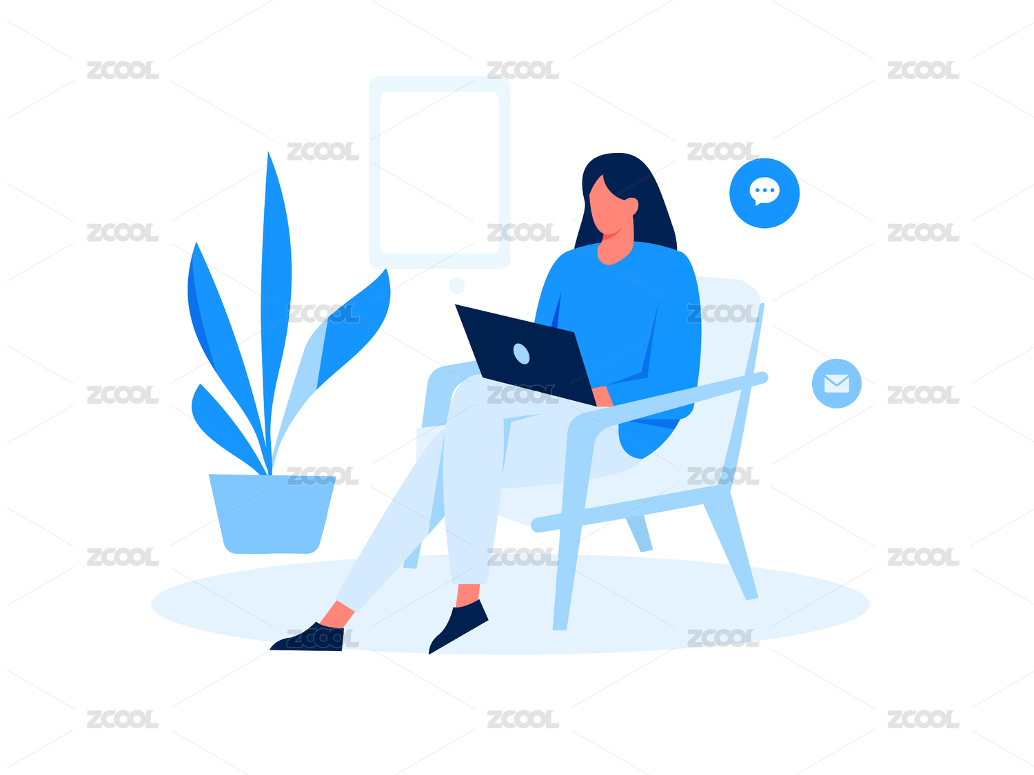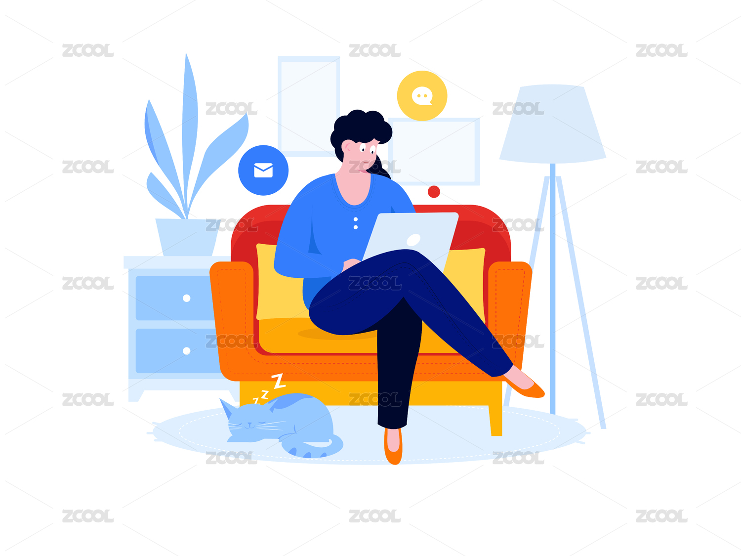 在客厅里上网完成工作的女士,扁平矢量人物场景创意概念插画