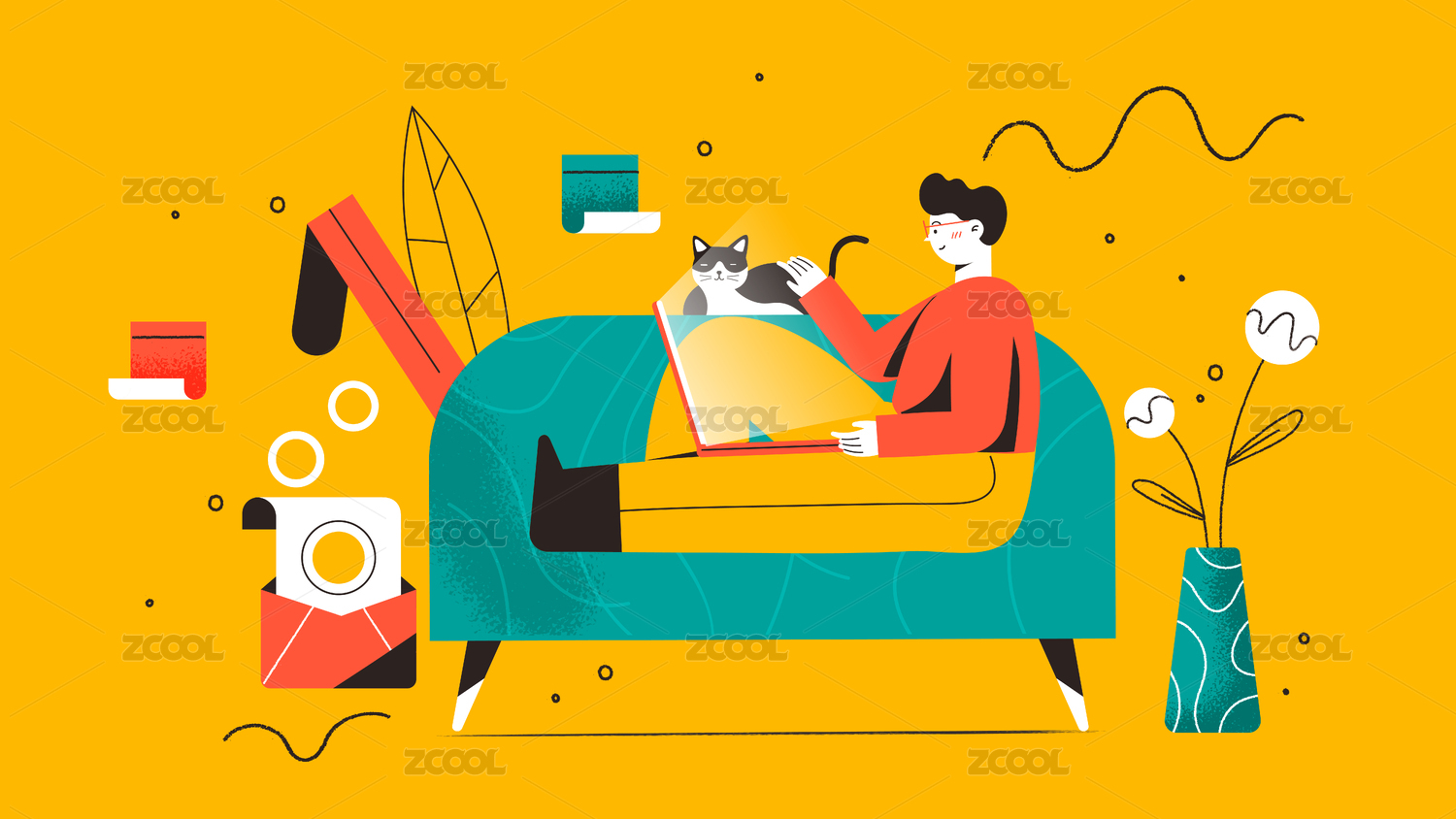 卡通自由职业工作吸猫办公求职矢量背景插画