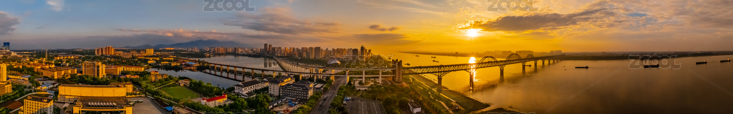 中国江西省九江市黄昏暮色长江大桥外滩建筑