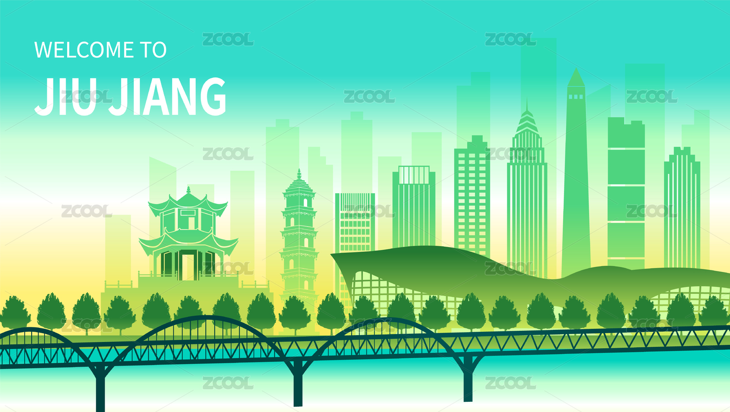 中国江西九江市城市天际线矢量插画绿色