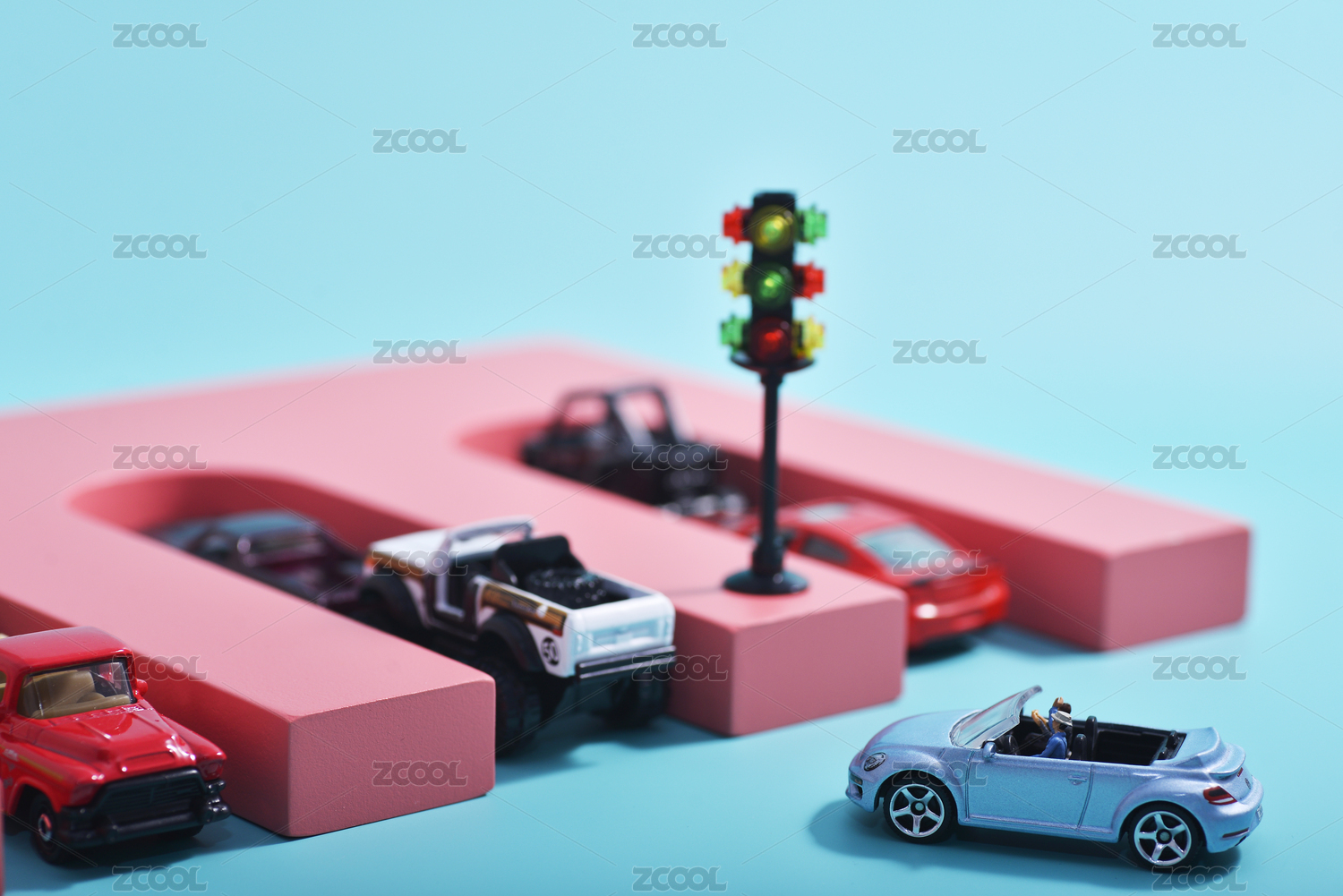 蓝色背景上的车辆与小人偶关于城市交通思考