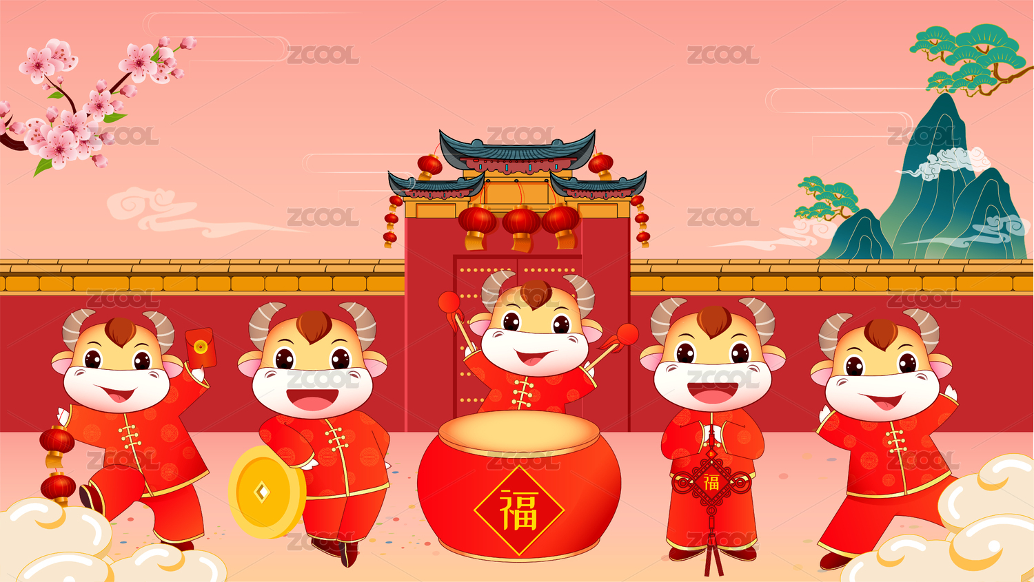 福牛闹新春的喜庆背景插画