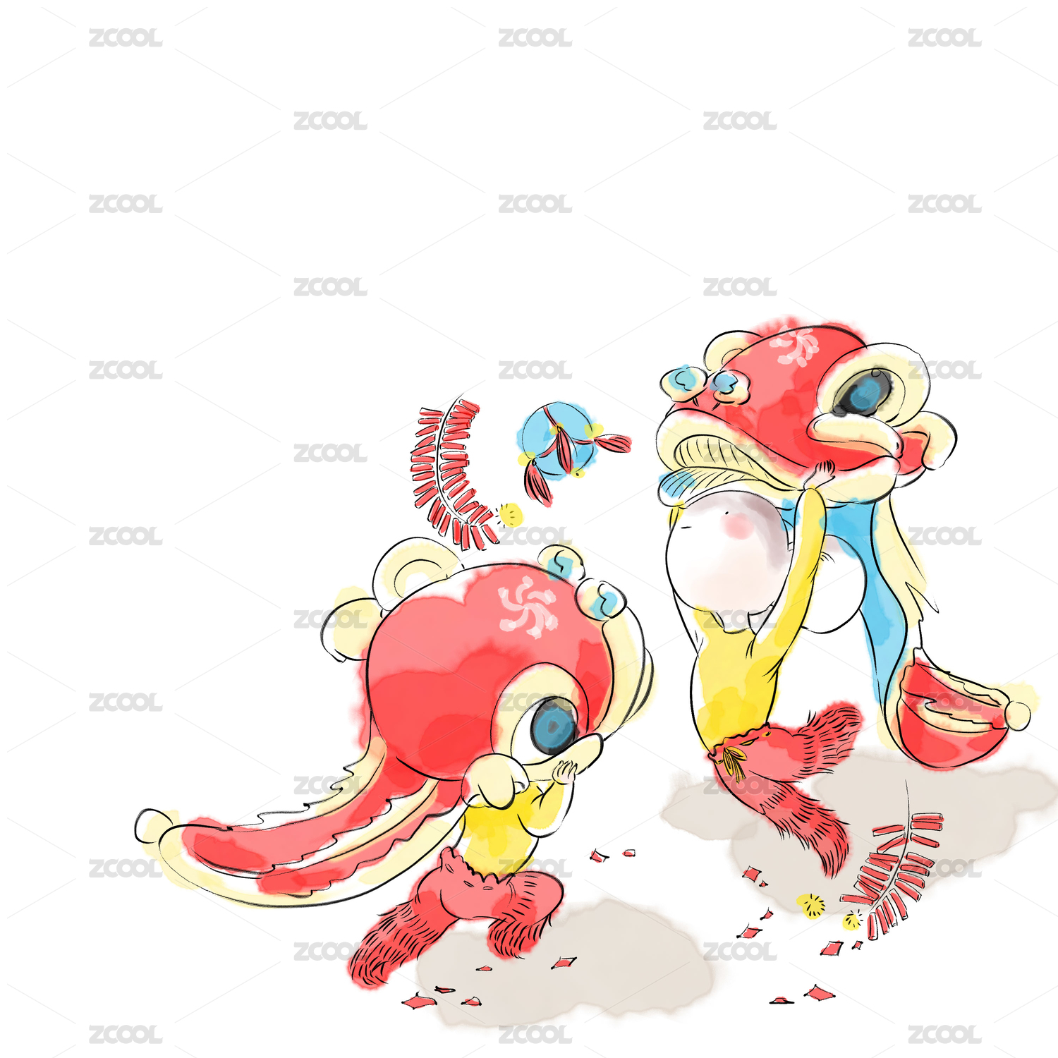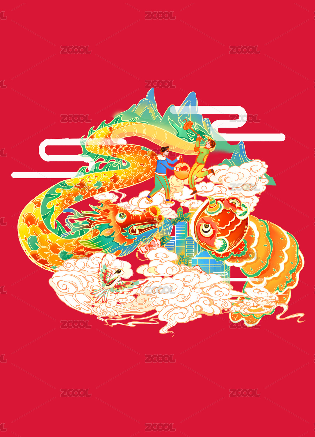 舞龙舞狮闹新春国风插画