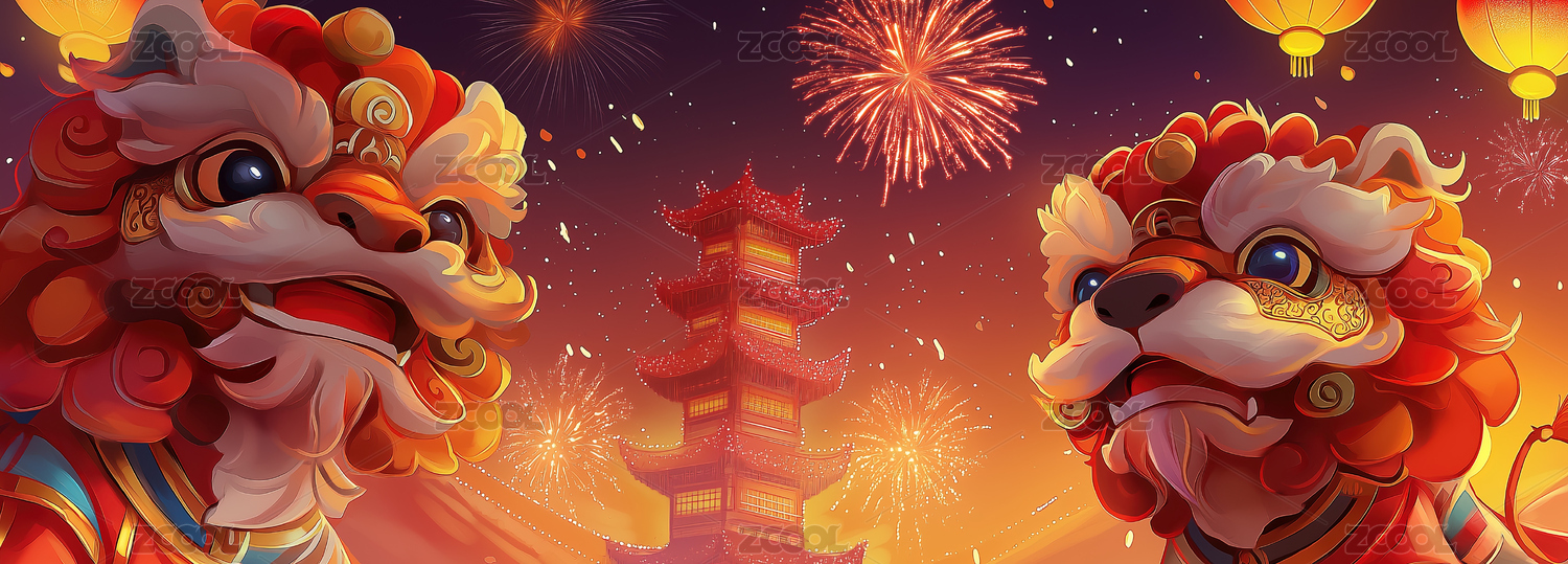 喜庆新春舞龙舞狮节日氛围背景插画