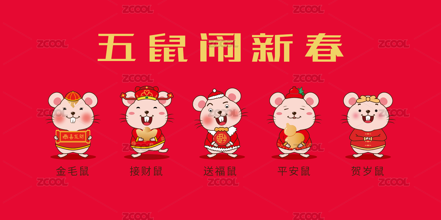 不同动作表情的五只小老鼠闹新春
