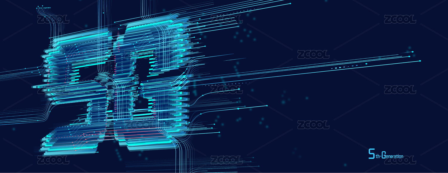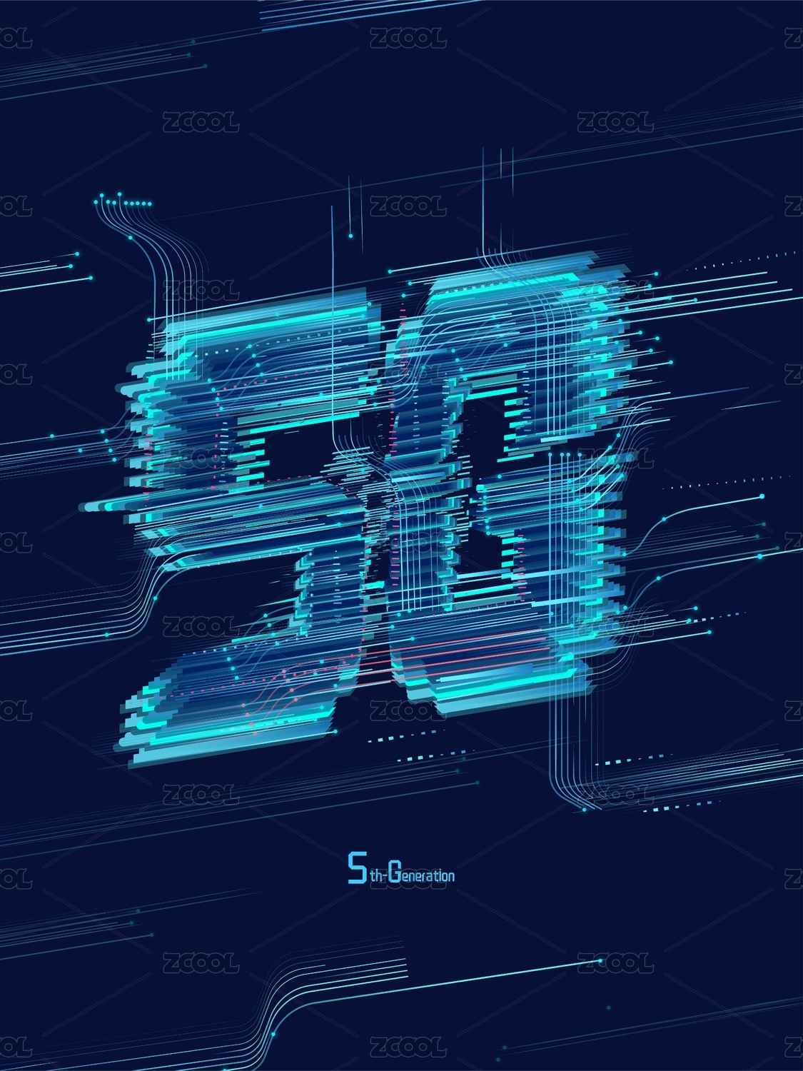 芯片中呈现出出飞速的光线与光斑组成的5G字体艺术图形(科技感矢量插图)