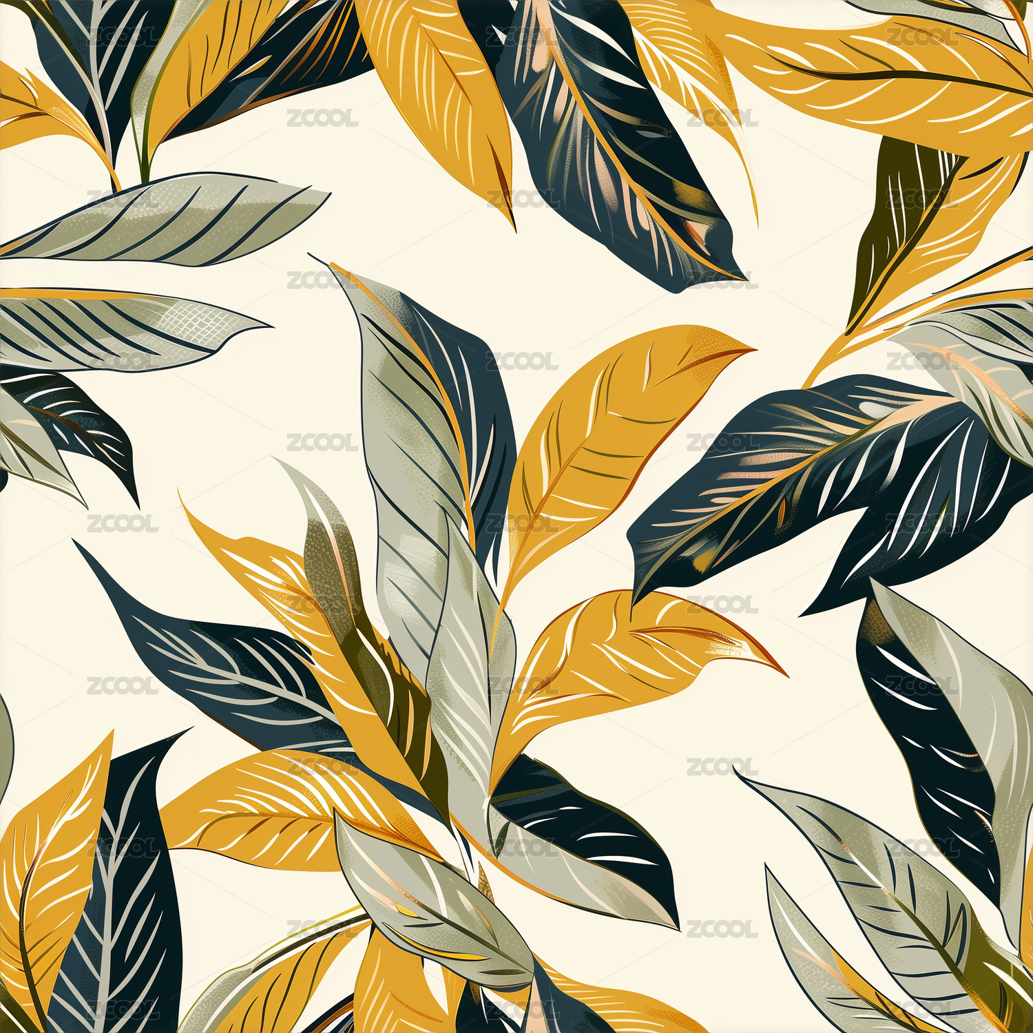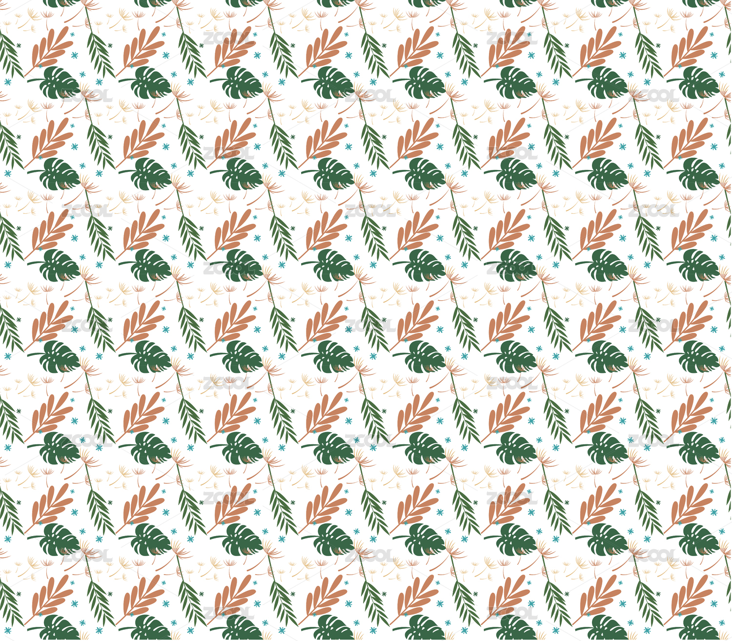 自然分散植物叶子无缝循环四方连续印花图案