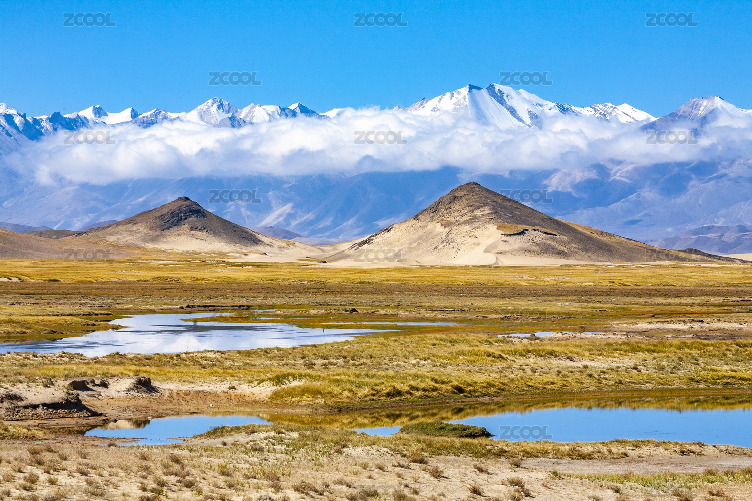 西藏萨嘎县到霍尔乡219国道的湿地雪山风