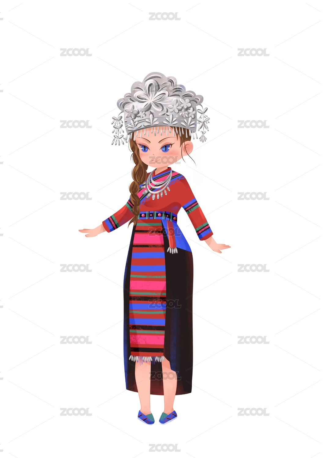 卡通手绘可爱苗族女孩站姿元素插画