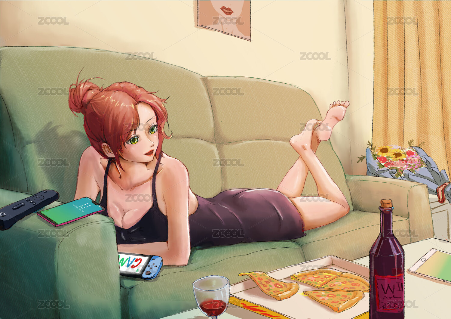 创意插画原创插画撸猫单身生活日常休闲夏天绿植蓝色手绘插画