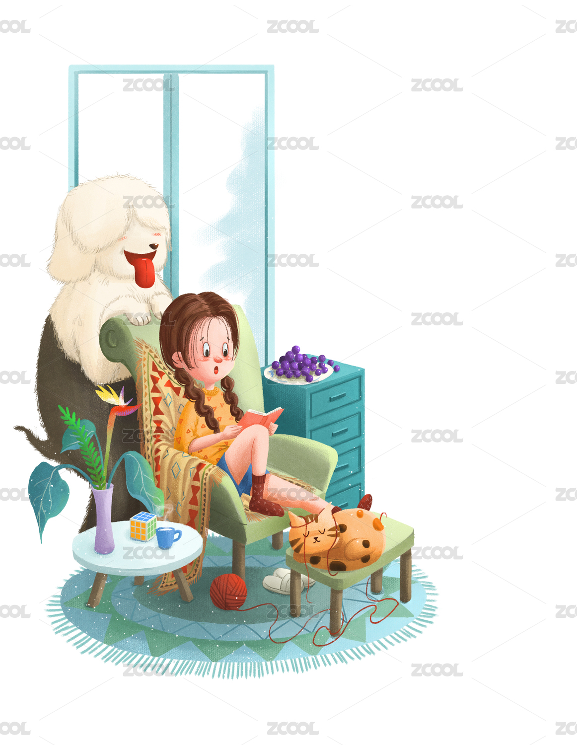 绿色地毯上有沙发女孩狗和猫的单身生活