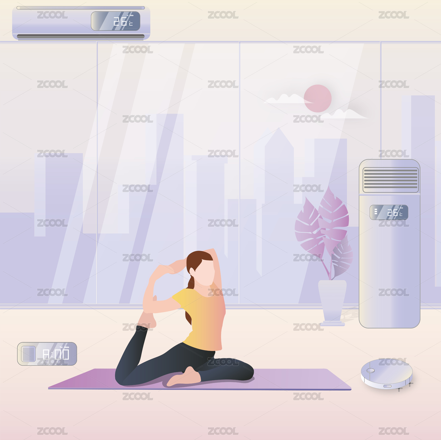 美丽时尚的年轻单身女孩在健身房室内练瑜伽锻炼身体,一边开着智能空调感受科技带来的乐趣插画背景海报
