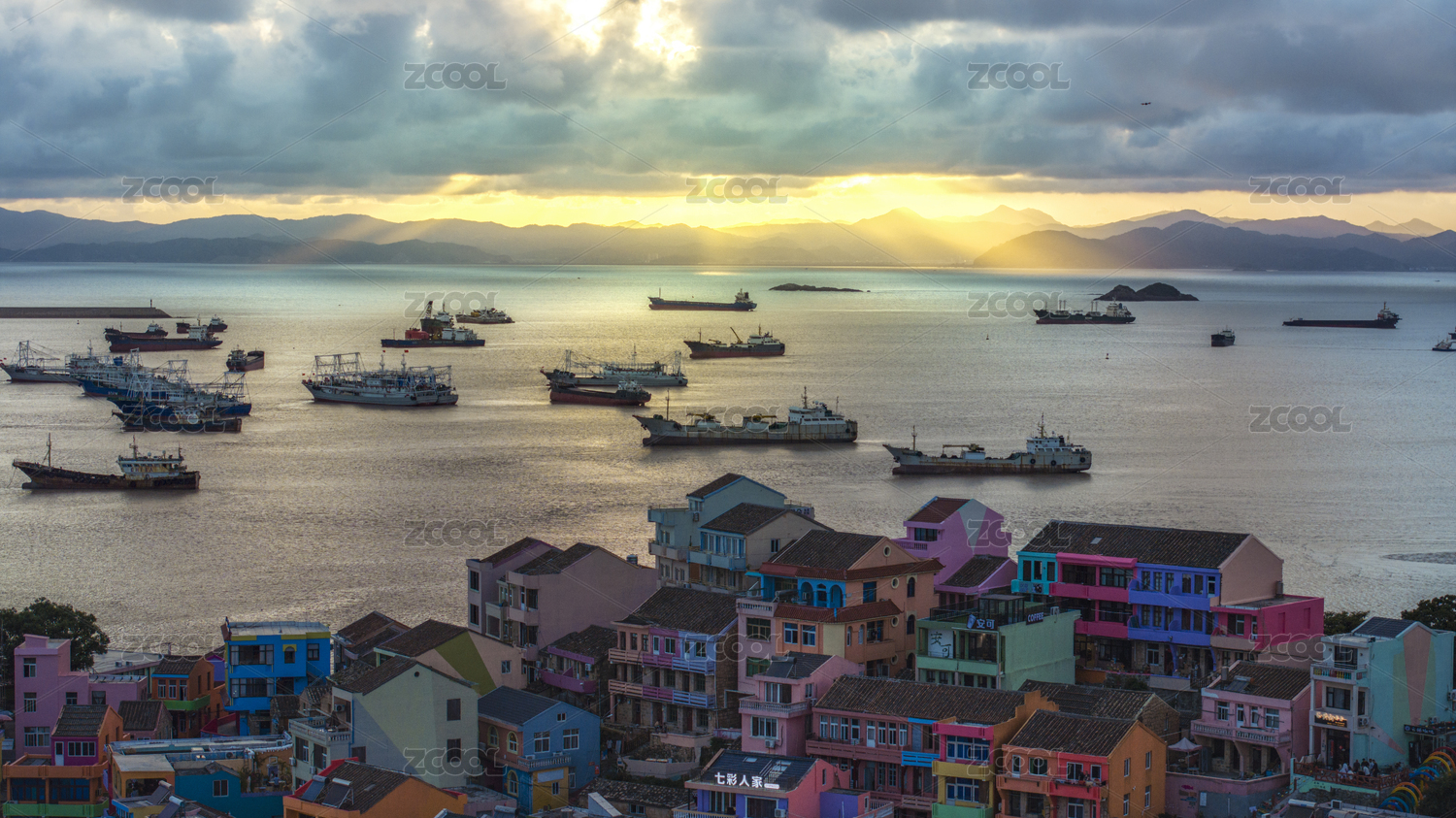 中国浙江台州温岭石塘七彩小渔村金色晚霞航