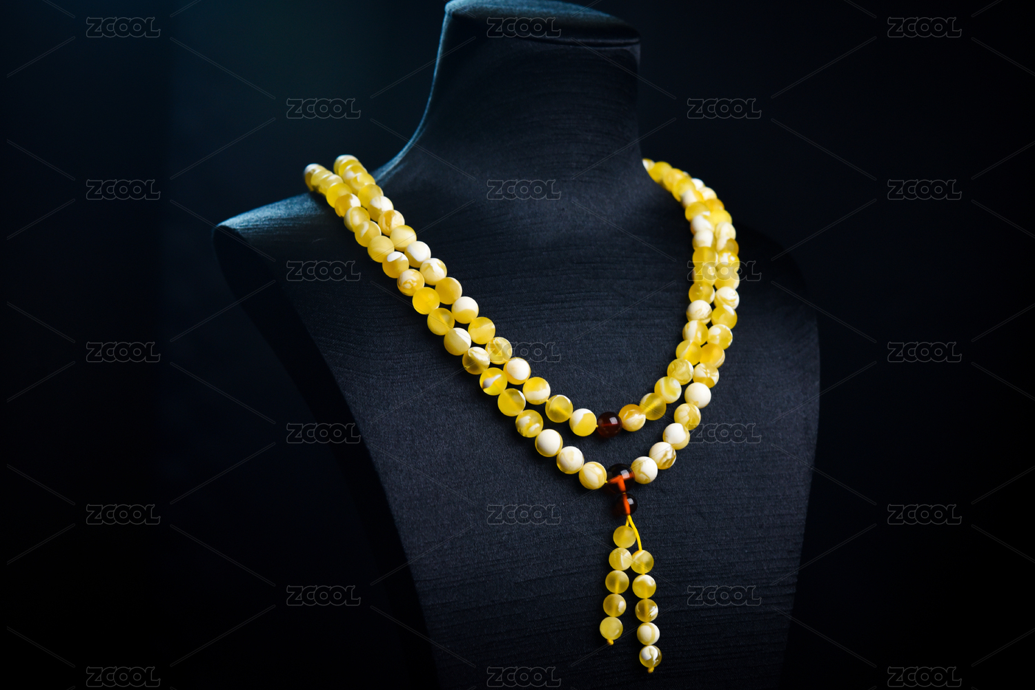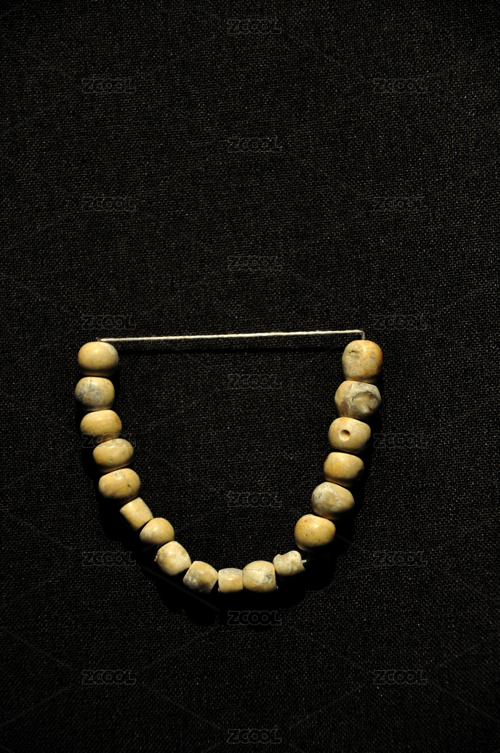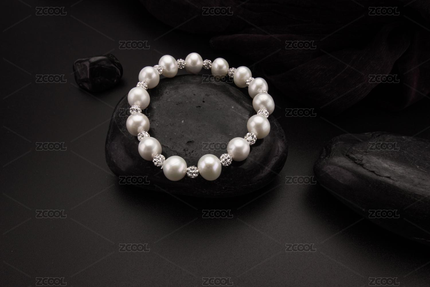 亮白的珍珠串珠与黑色鹅卵石放在深色的背景中