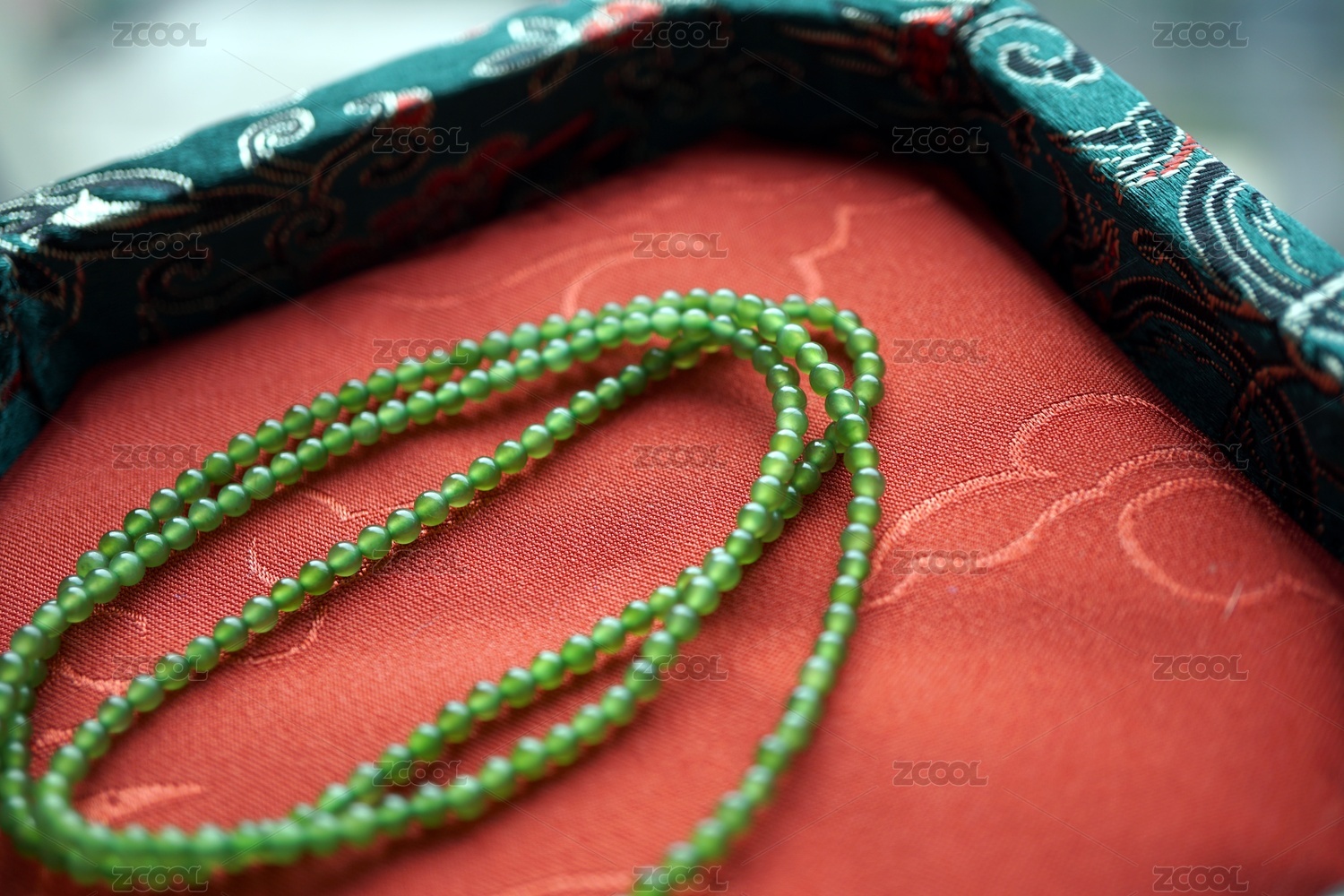 和田玉碧玉项链翠绿珠串置于中式锦缎上