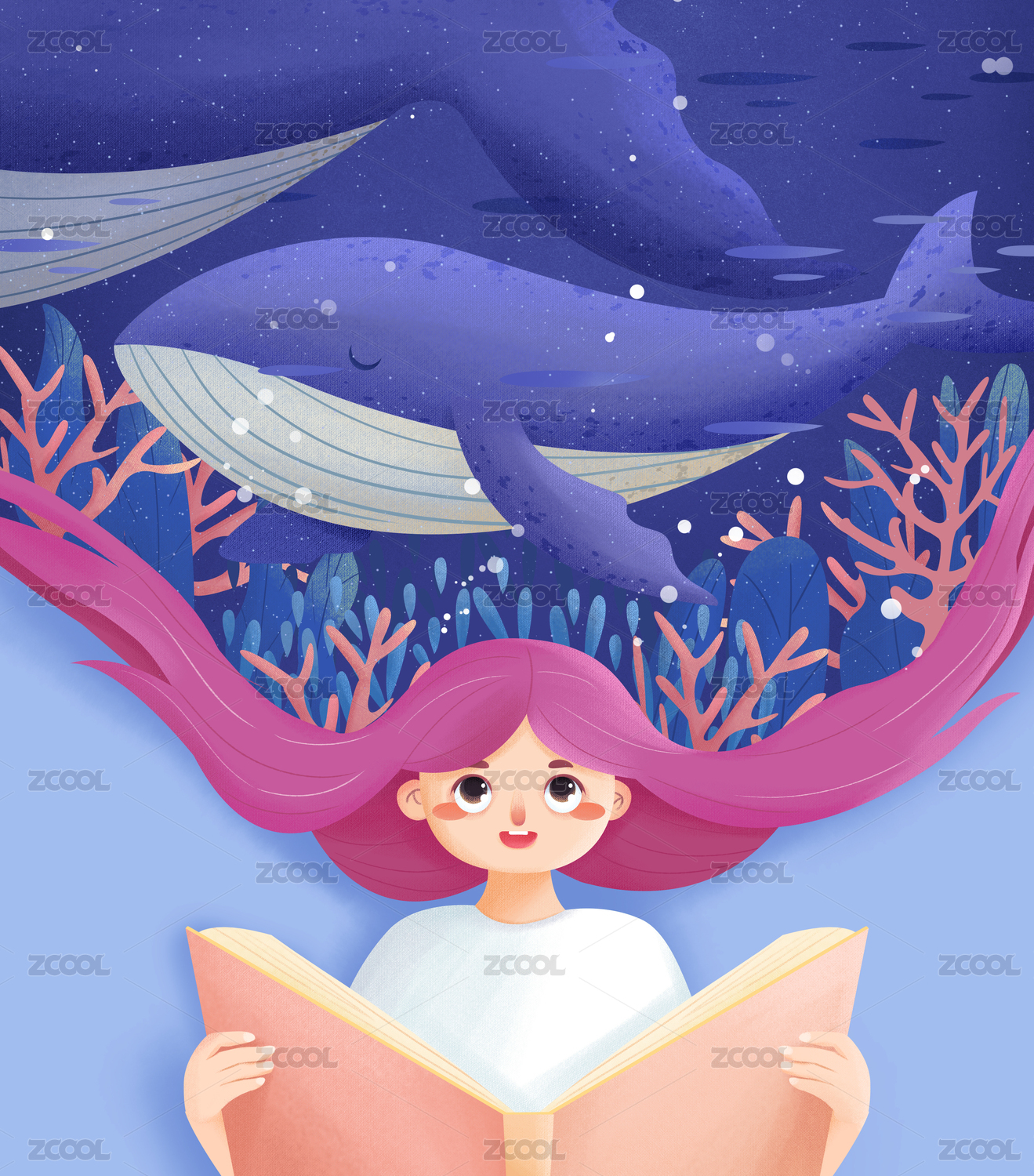 女孩读书创意插画