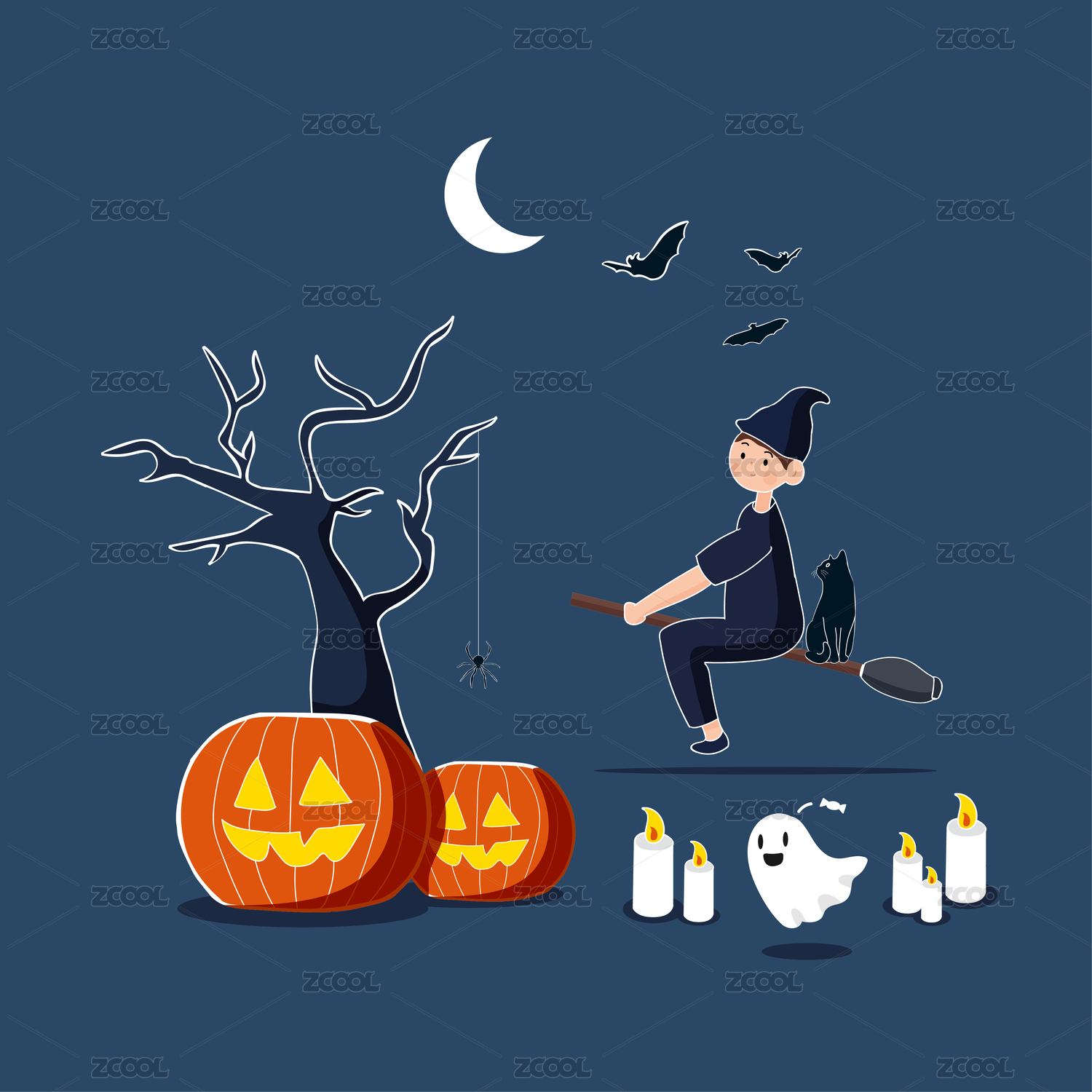 万圣节南瓜灯幽灵蝙蝠巫师骑扫把矢量插画