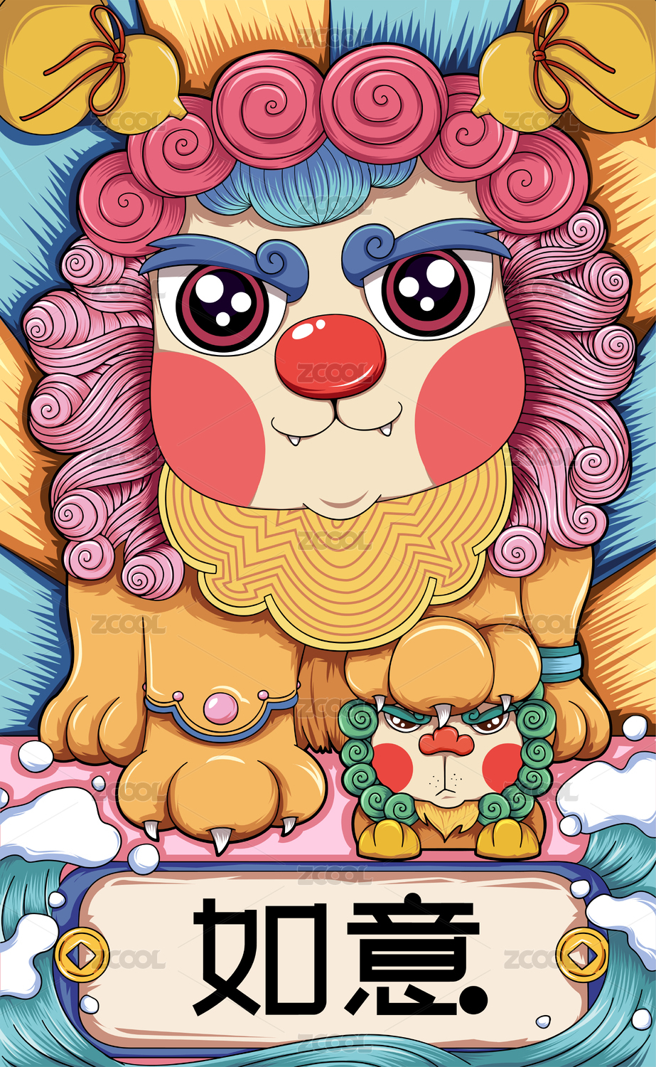 国潮插画石狮子脚踩小狮子
