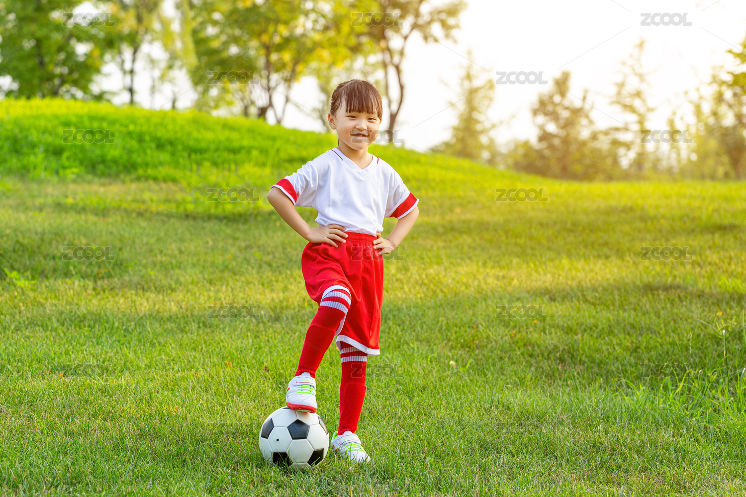 小女孩双手叉腰脚踩足球站在草地上