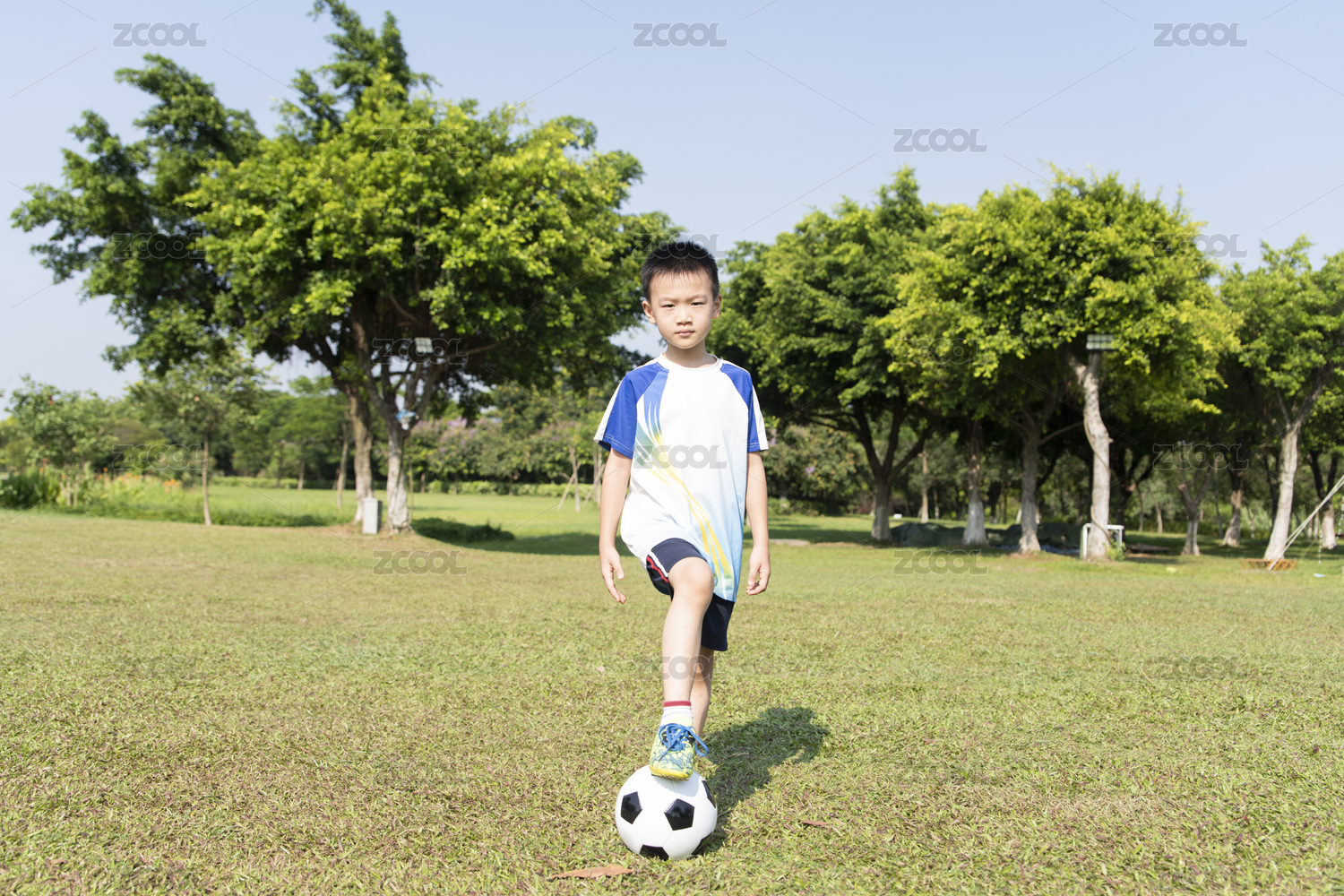 草地上脚踩足球的小男孩