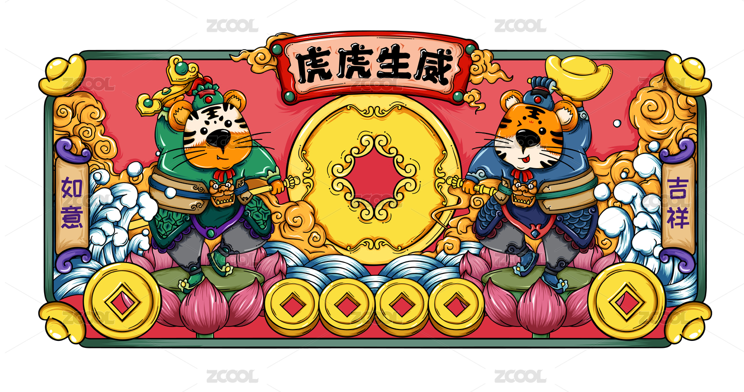 2022虎年门神手拿如意元宝脚踩莲花