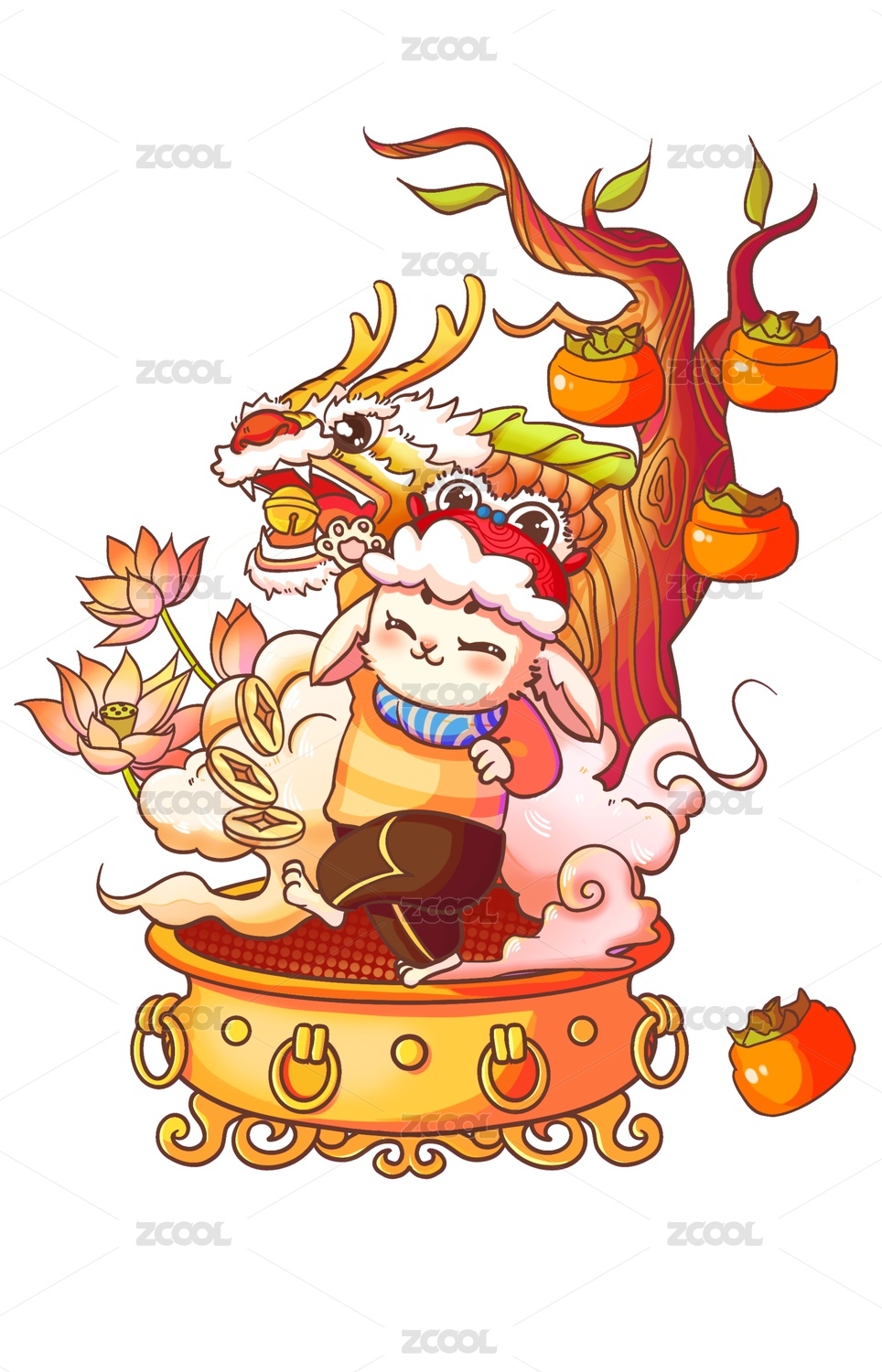 高高举手脚踩聚宝盆背后一条龙的兔子