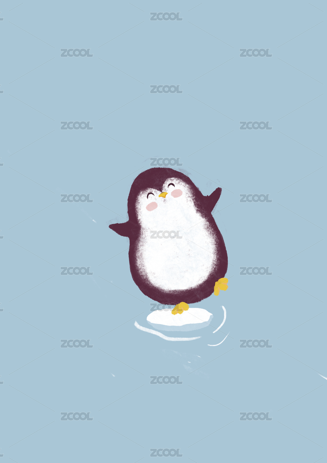 小企鹅一脚踩在冰块上快摔倒,扁平插画