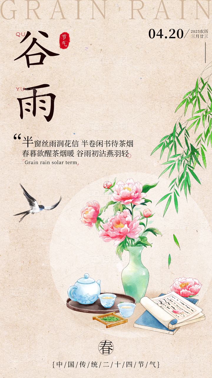 牡丹花下的茶壶静物谷雨节气手机插画海报