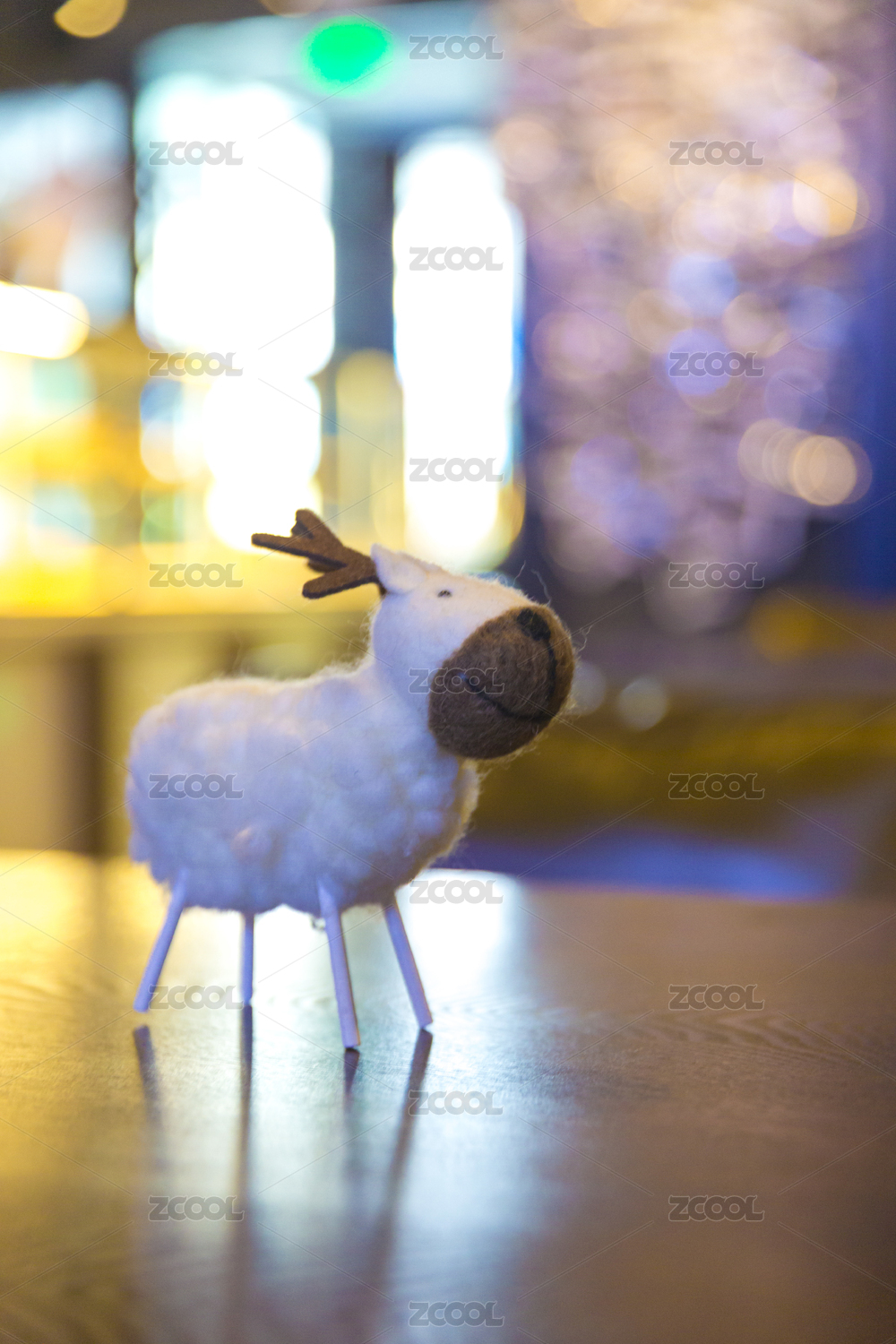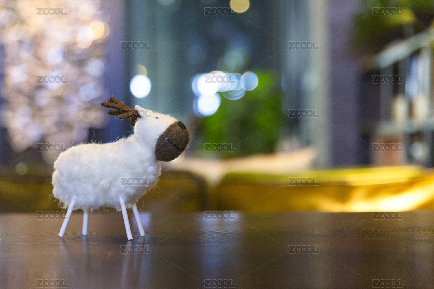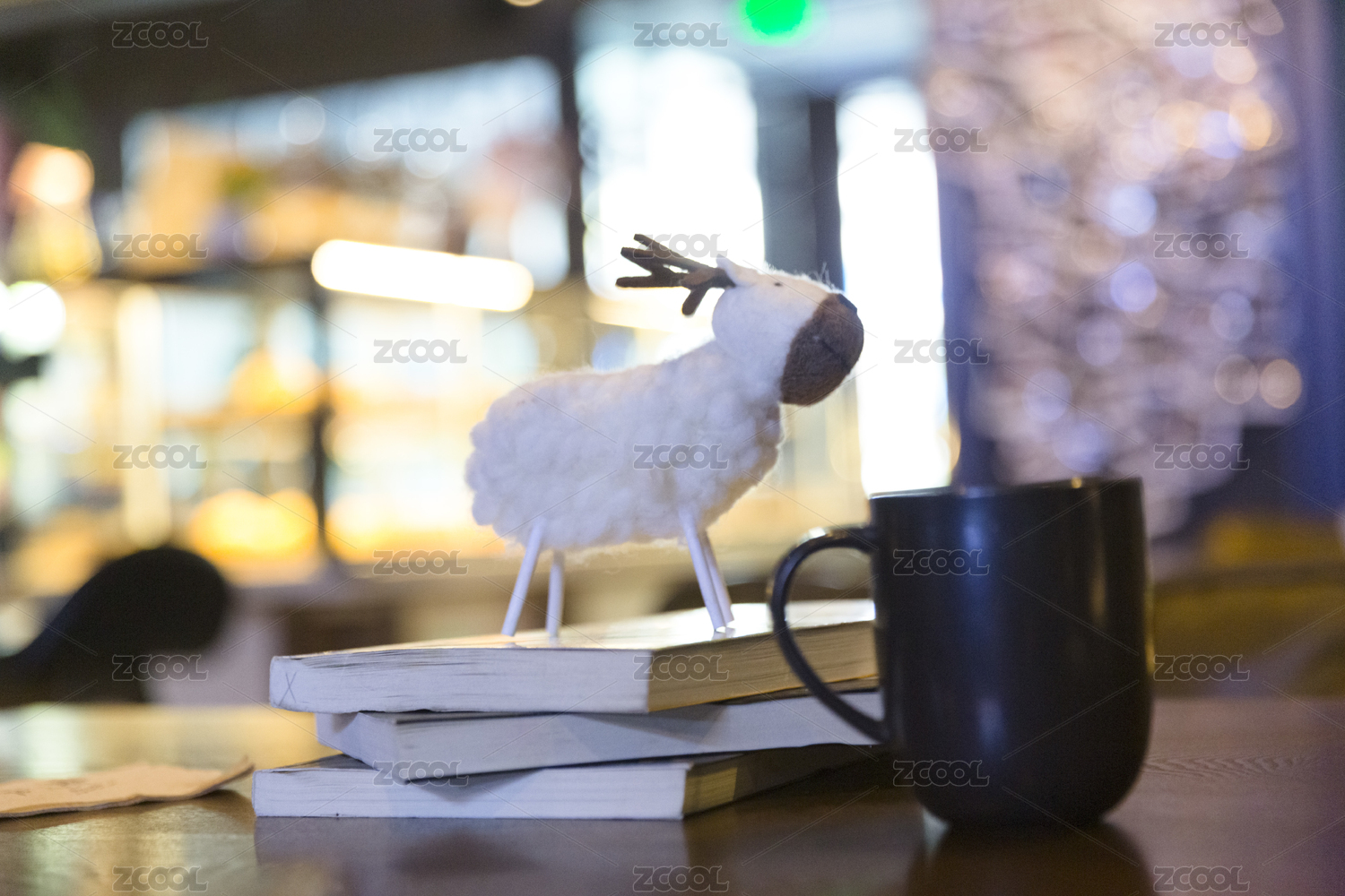 一只羊毛毡制作成的小鹿摆件摆放在咖啡馆的木桌上