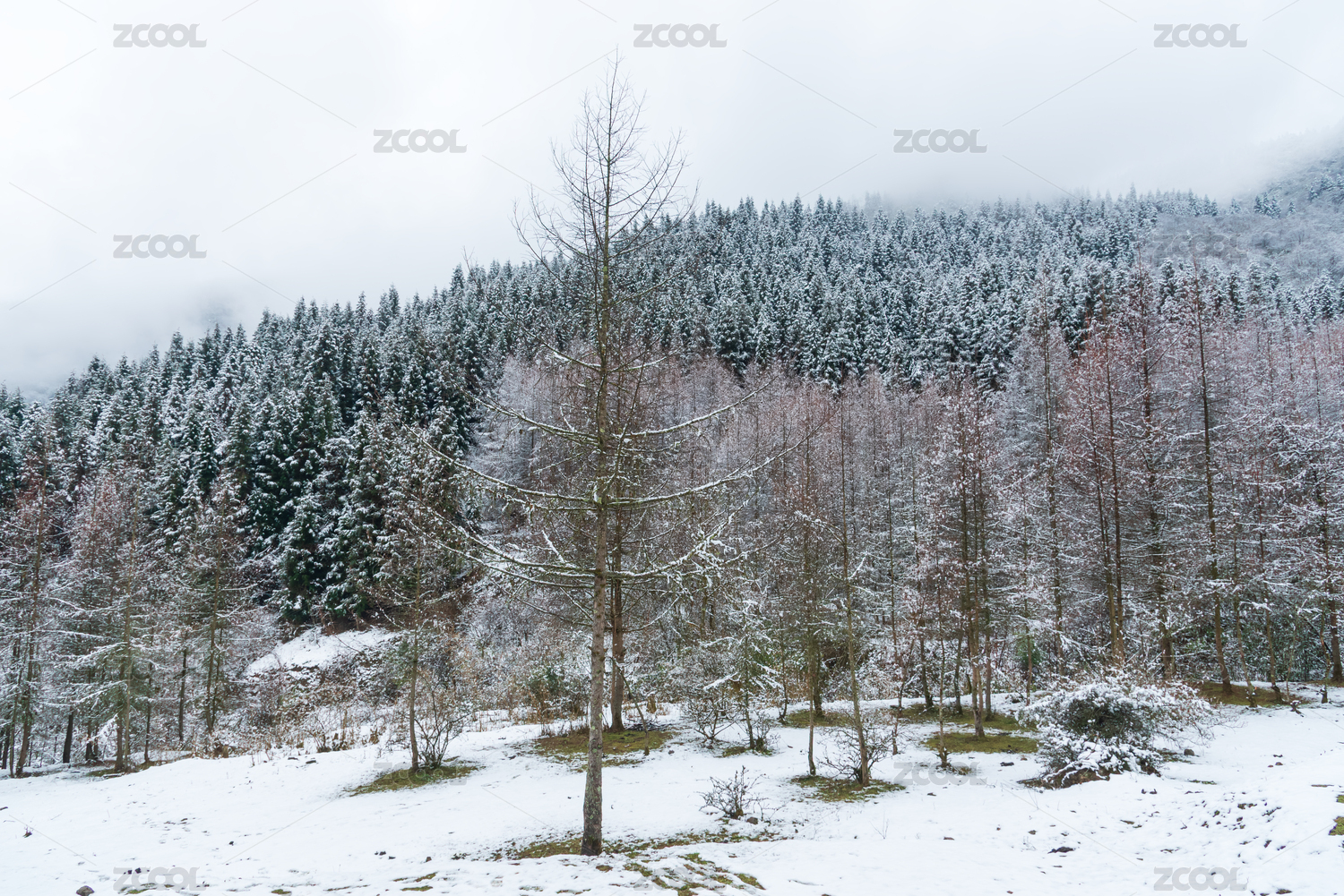 中国新疆喀纳斯河谷冬季森林雪景和马群风光