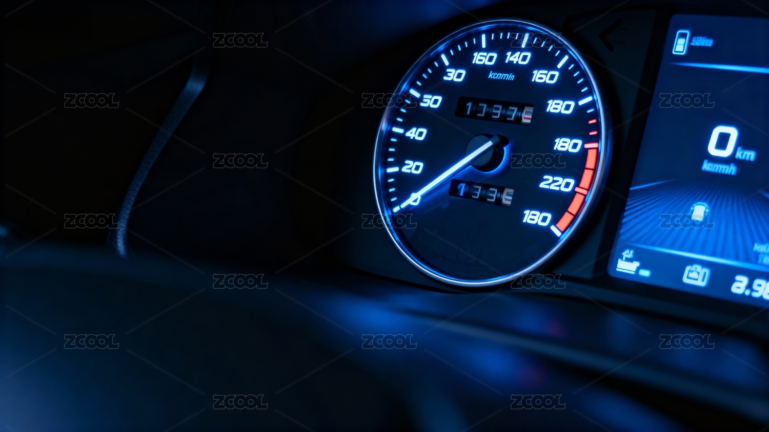 汽车仪表盘夜间蓝色灯光显示